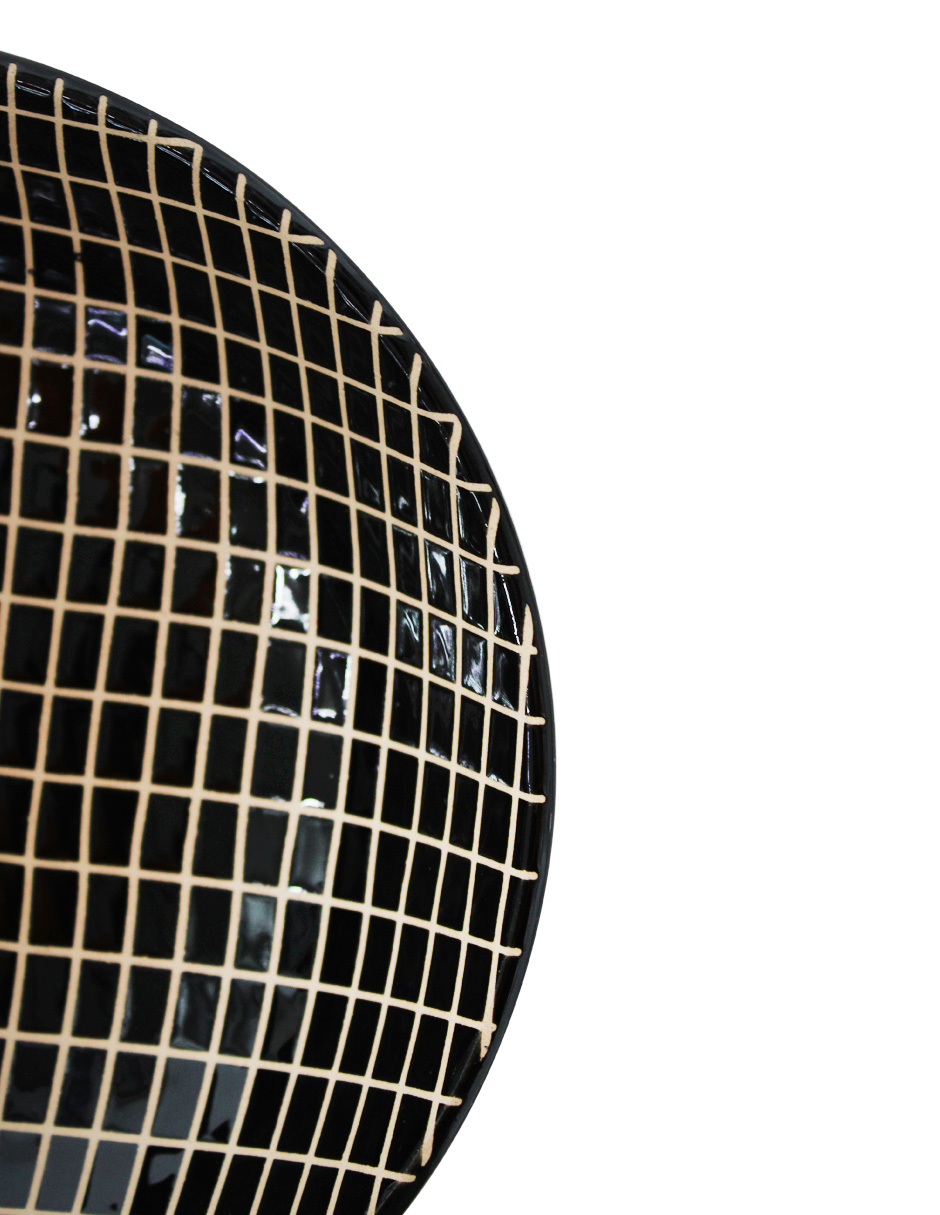 Un bowl de porcelana en color negro con un clásico diseño de cuadros. Su color audaz y su patrón atemporal lo hacen ideal para una mesa moderna y sofisticada. Mide 19.5×19.5×5.4cm.