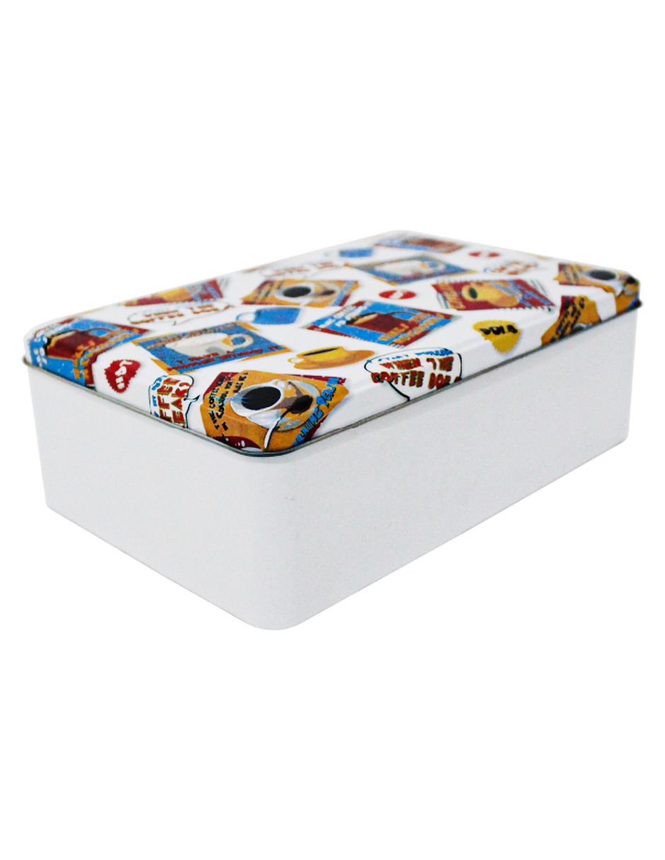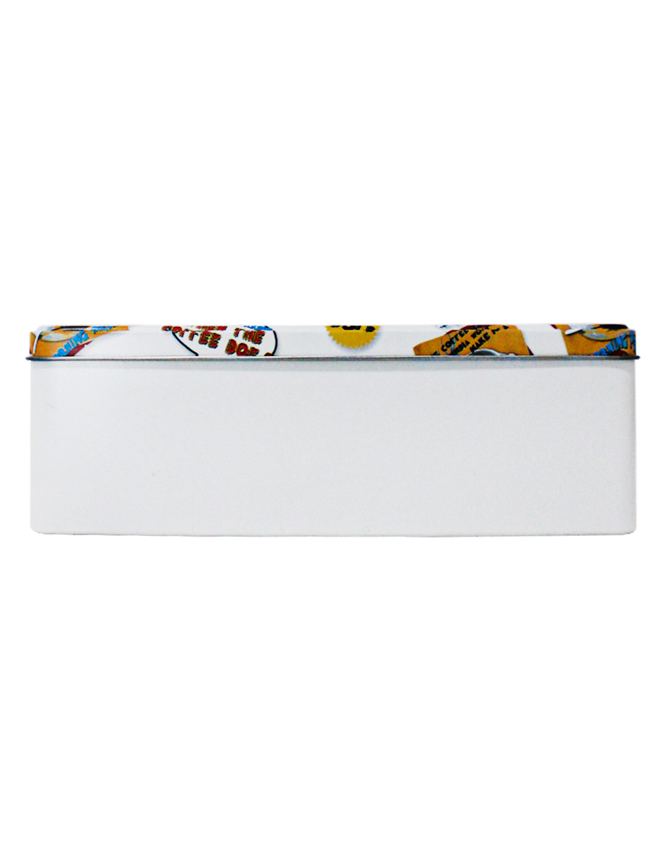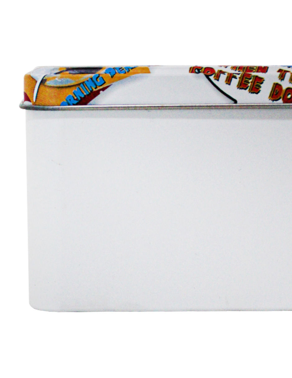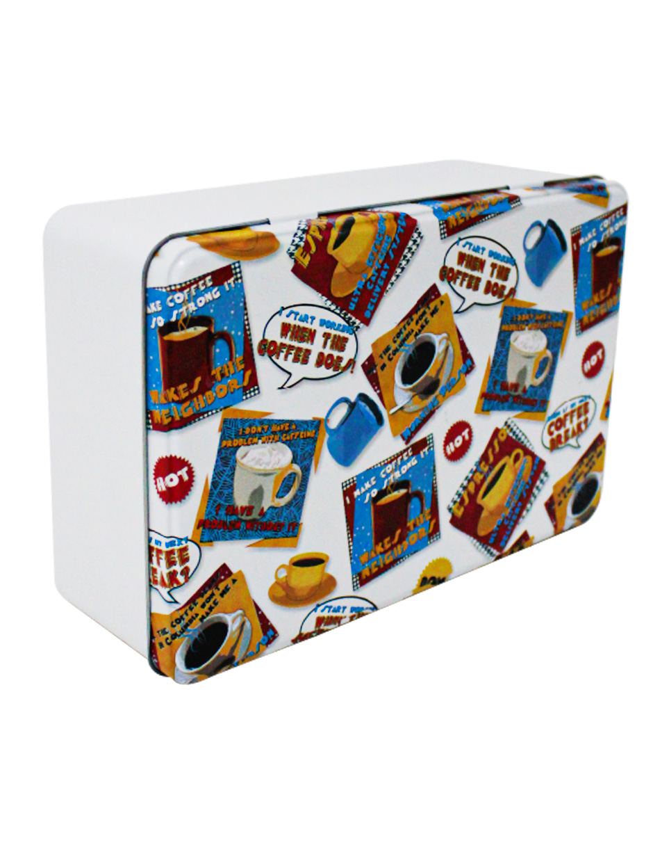 Dale un toque vintage a tu cocina. Esta caja de lámina rectangular con diseño de textos de café en blanco es perfecta para guardar tus granos de café o galletas, añadiendo un acento nostálgico. Su diseño te hará sentir la calidez y la comodidad. Mide 20x13x6.8cm.