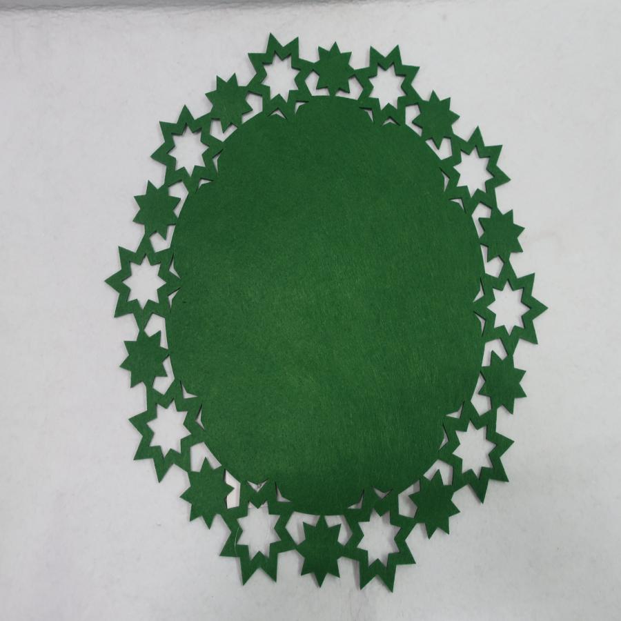 Un festivo camino de mesa de fieltro verde con un diseño de estrellas, con medidas de 40x40x0.3 cm. Ideal para añadir un toque de tradición y fantasía.
