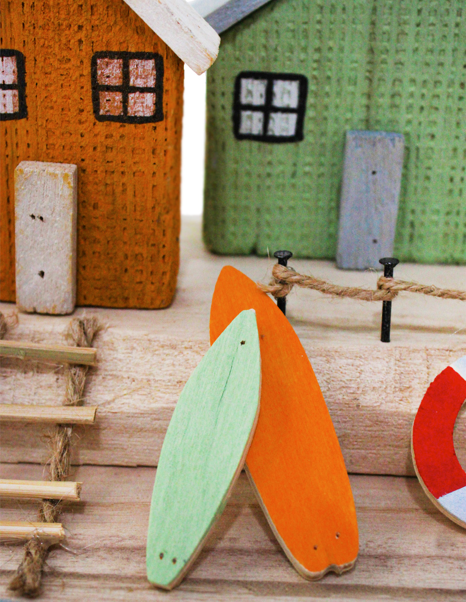 Decoración con un original diseño de casas de playa con tablas de surf. Esta pieza es ideal para quienes buscan una decoración marinera y rústica. Su diseño único evoca una sensación de frescura y tranquilidad, perfecta para crear un ambiente único y lleno de encanto. Material: madera.
