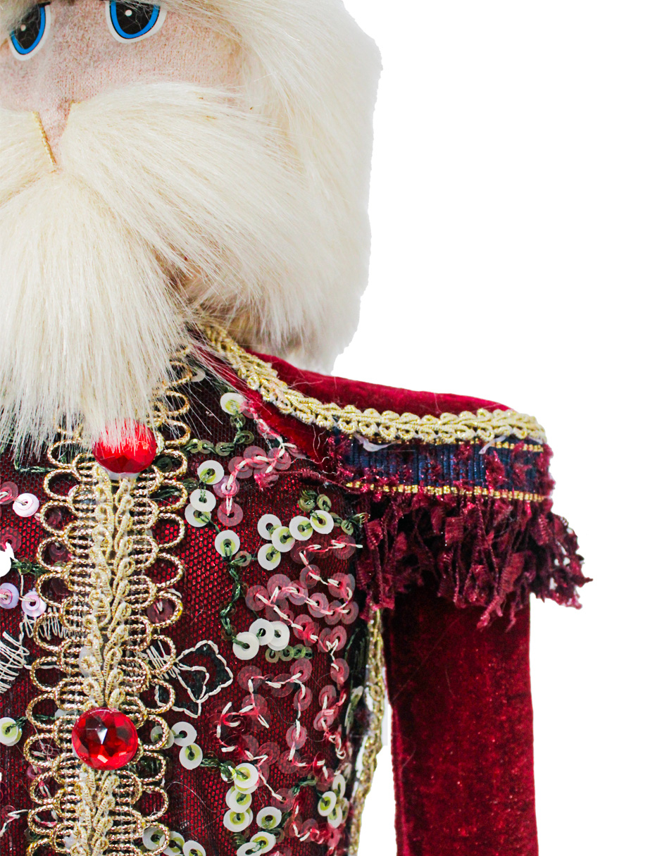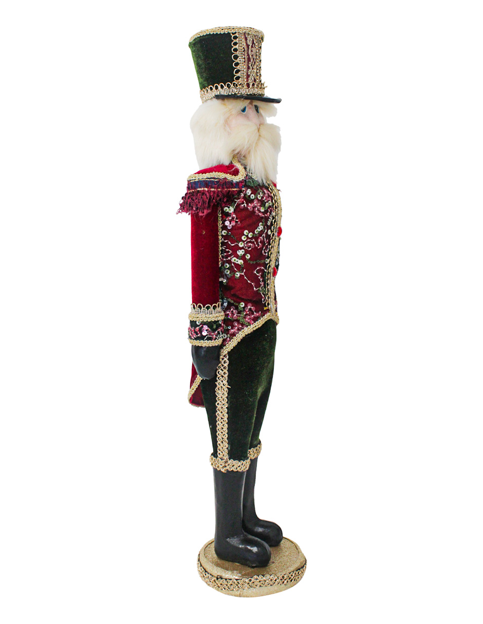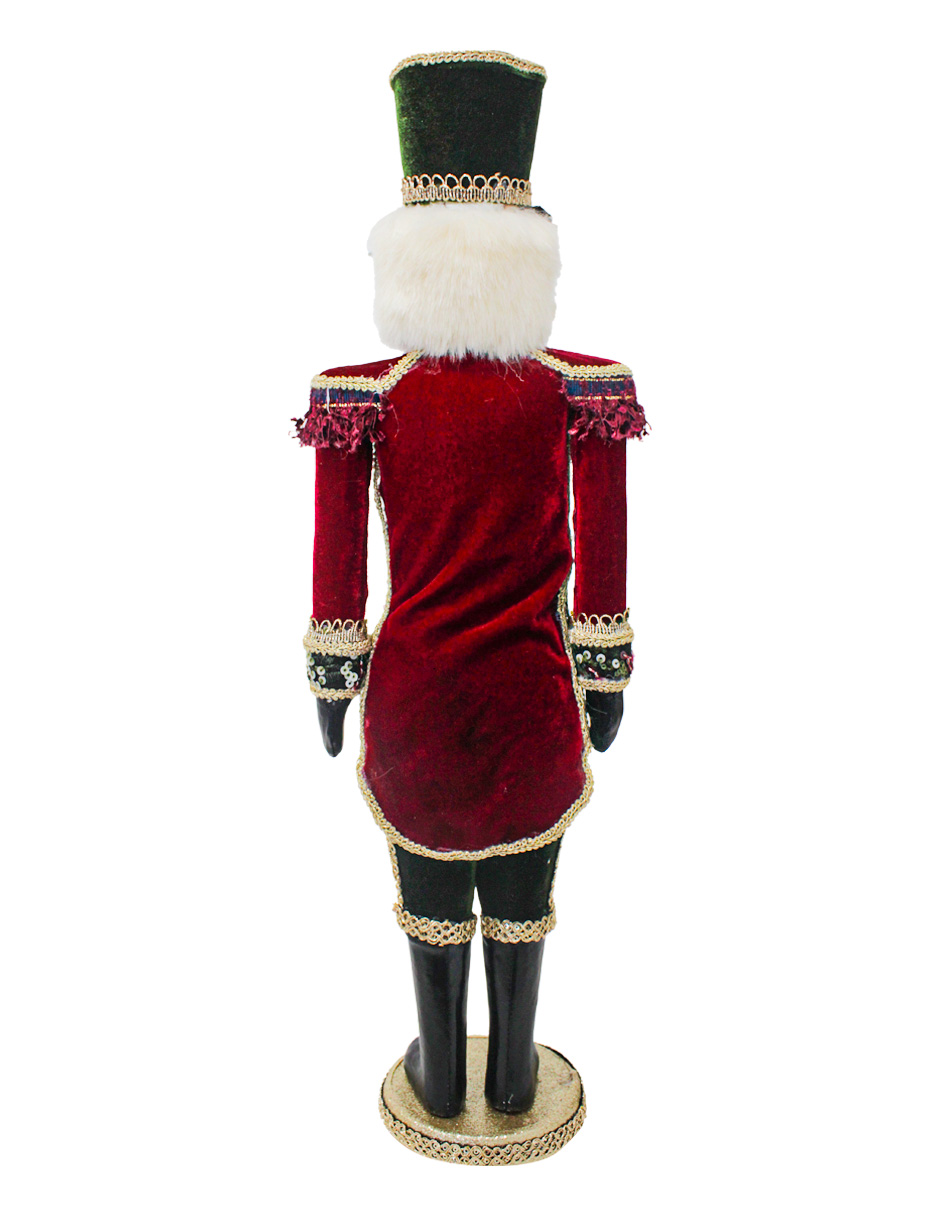 Cascanueces de 18x12x63cm con traje de terciopelo y brocado en tonos rojos con verdes, y elegante sombrero de copa. Su diseño detallado lo convierte en una pieza decorativa de gran distinción para tu hogar.