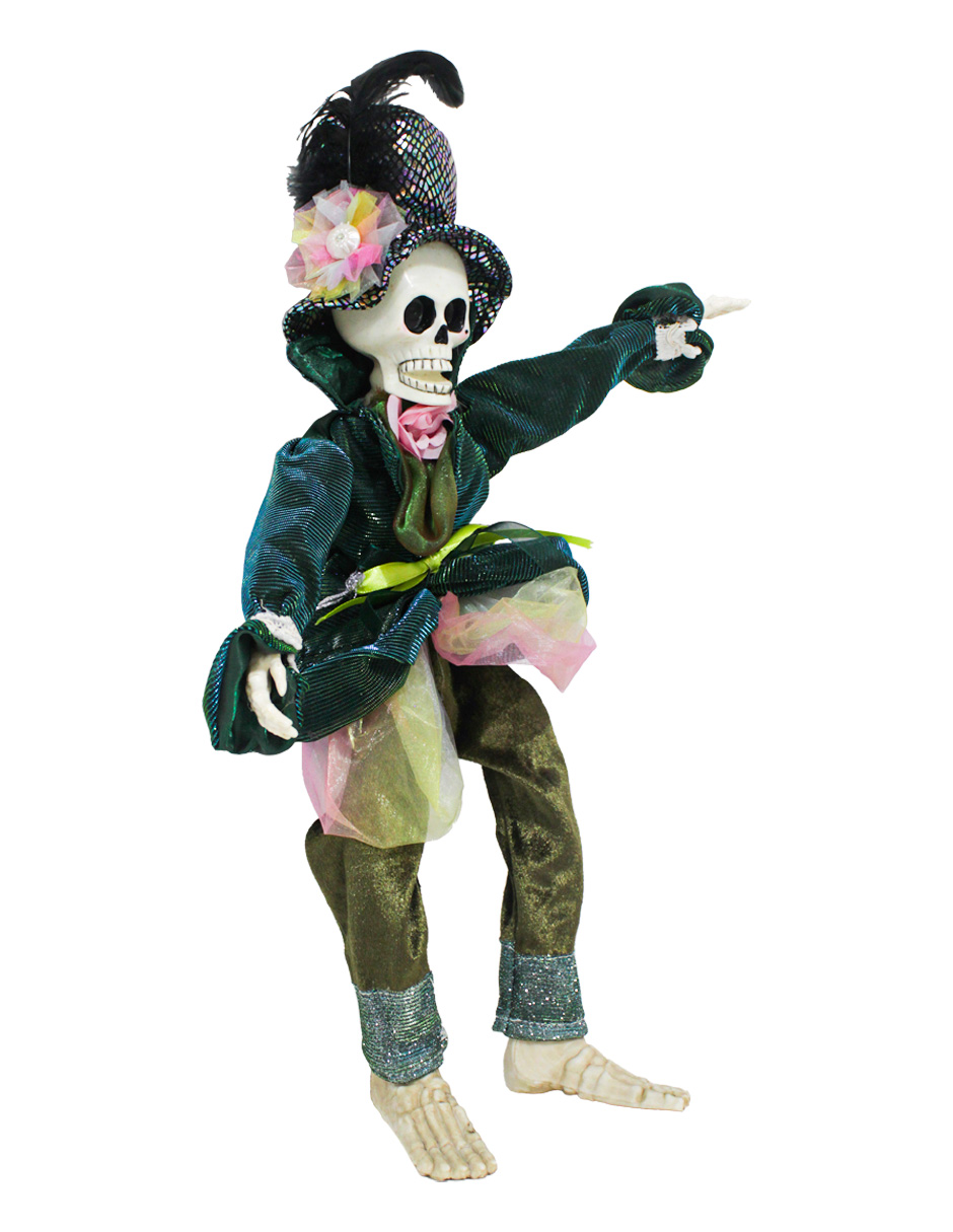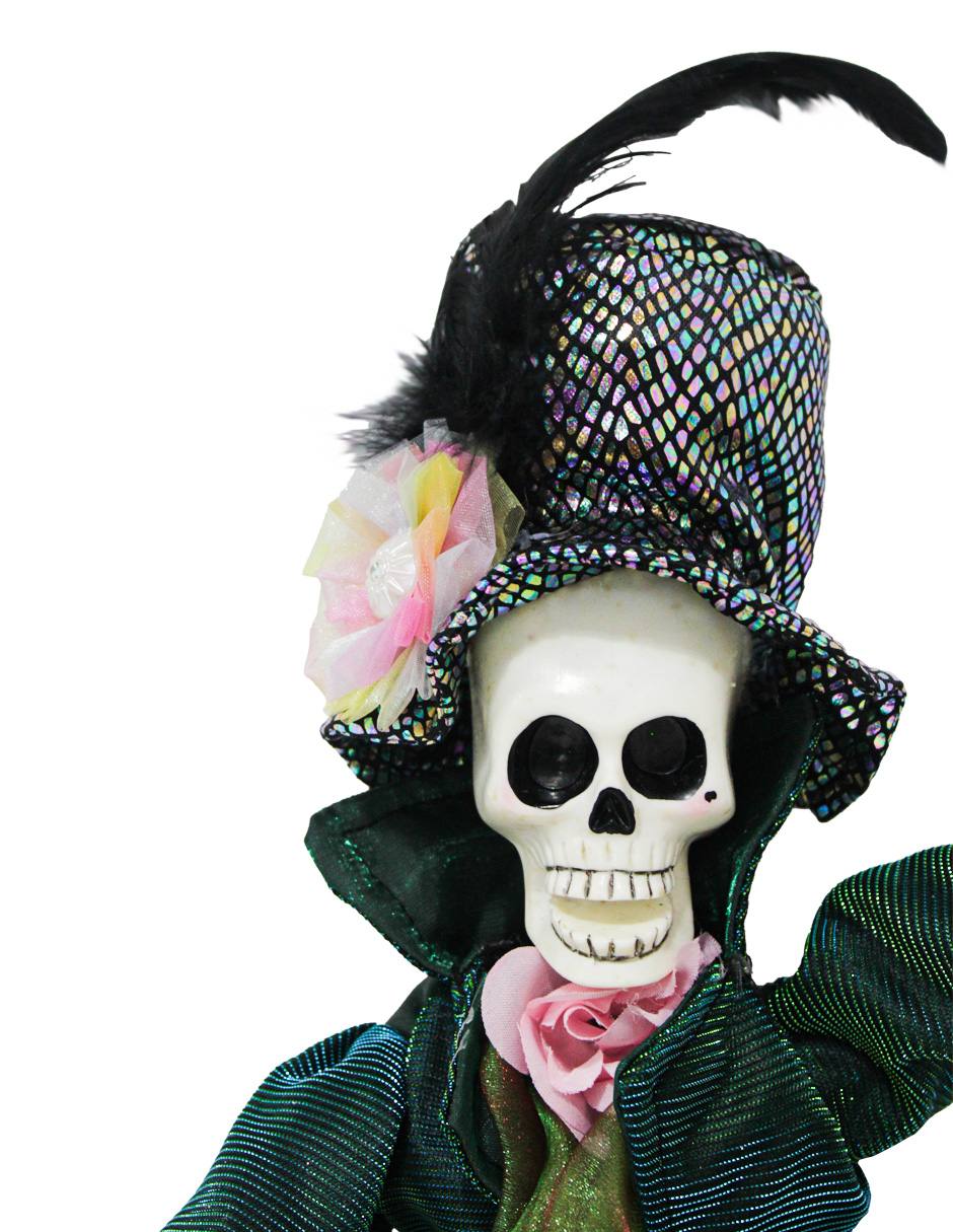 Un elegante Catrín con Traje Verde y Sombrero con Pluma Negra, con una altura de 50cm. Esta figura es ideal para añadir un toque de sofisticación y estilo a tu decoración de temporada.