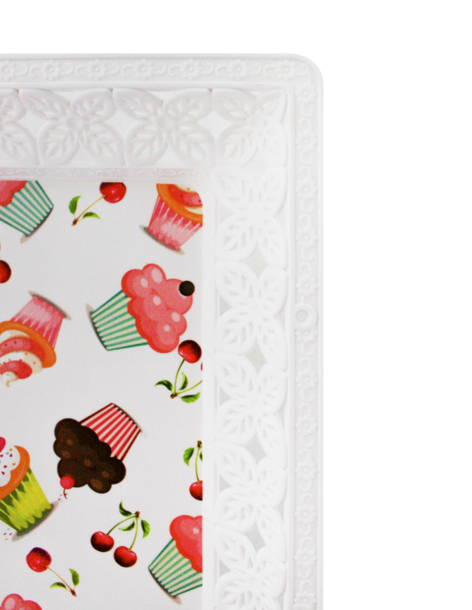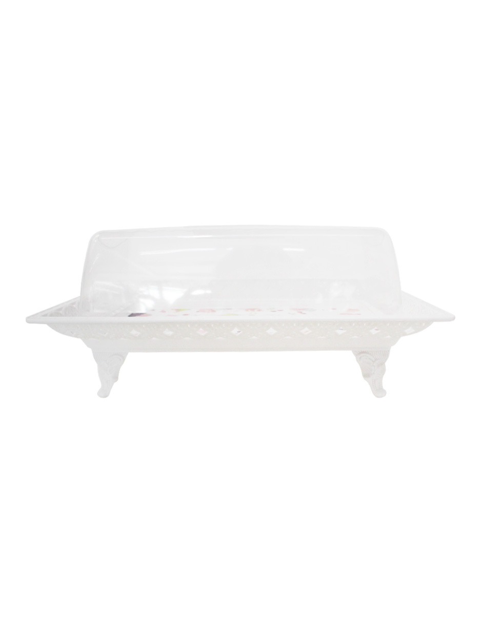 Charola rectangular de plástico con tapa estampado y orilla de encaje