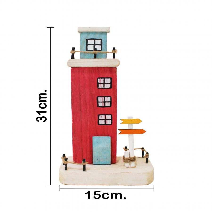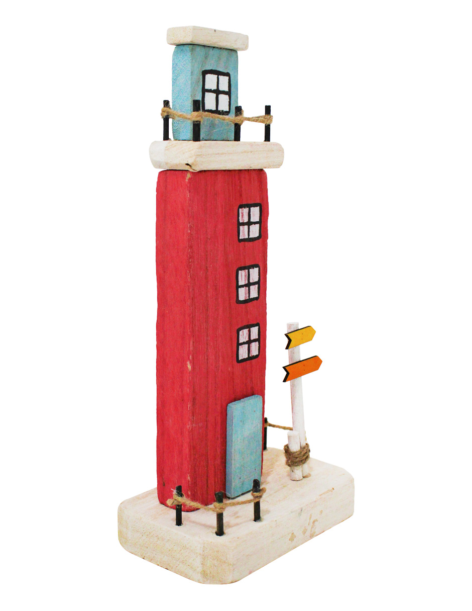 Decoración con un original diseño de faro en color rojo. Esta pieza es ideal para quienes buscan una decoración marinera y rústica. Su diseño único evoca una sensación de frescura y tranquilidad, perfecta para crear un ambiente único y lleno de encanto. Material: madera.