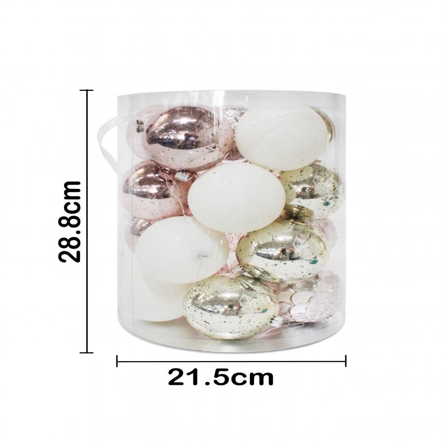 Display con 20 esferas de plástico en colores rosa, plateado y blanco. Son perfectas para añadir un toque de dulzura y glamour a tu árbol de Navidad. Miden 8cm.