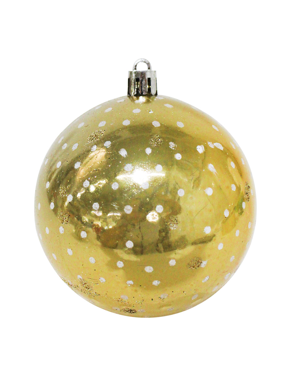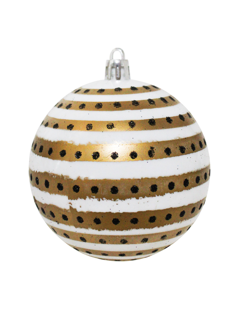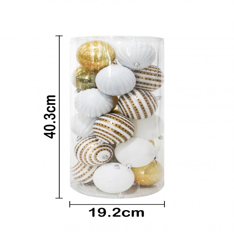Display de 24 esferas de plástico en color blanco con detalles dorados. Son perfectas para añadir un toque de elegancia y sofisticación a tu árbol.