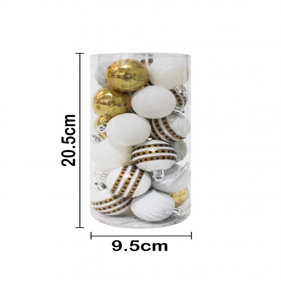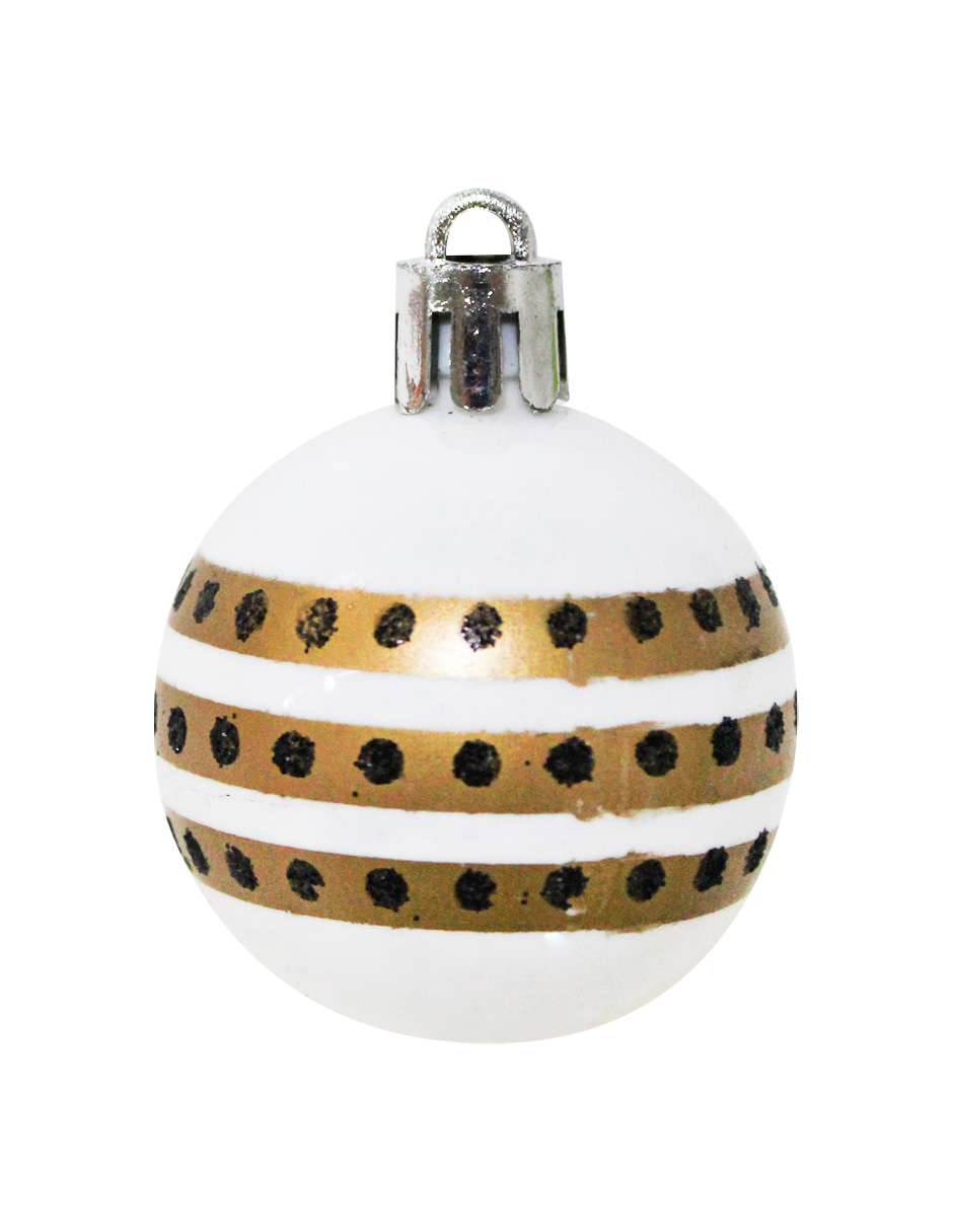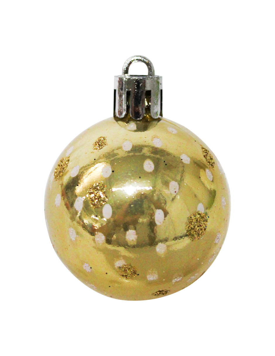 Display de 24 esferas de plástico en colores blanco y dorado con puntos. Son perfectas para añadir un toque de originalidad y diversión a tu árbol.