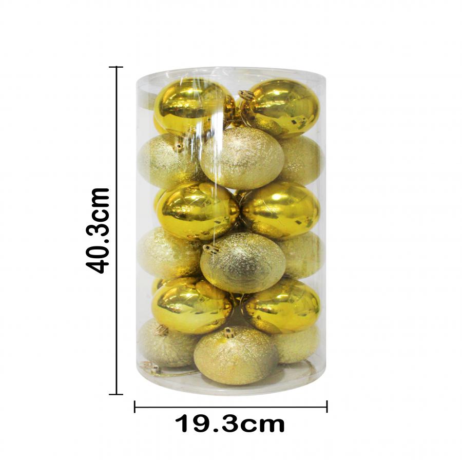 Display de 24 esferas de plástico en color dorado con acabados brillante y mate. Son perfectas para añadir un toque de originalidad y vitalidad a tu árbol. Miden 8cm.