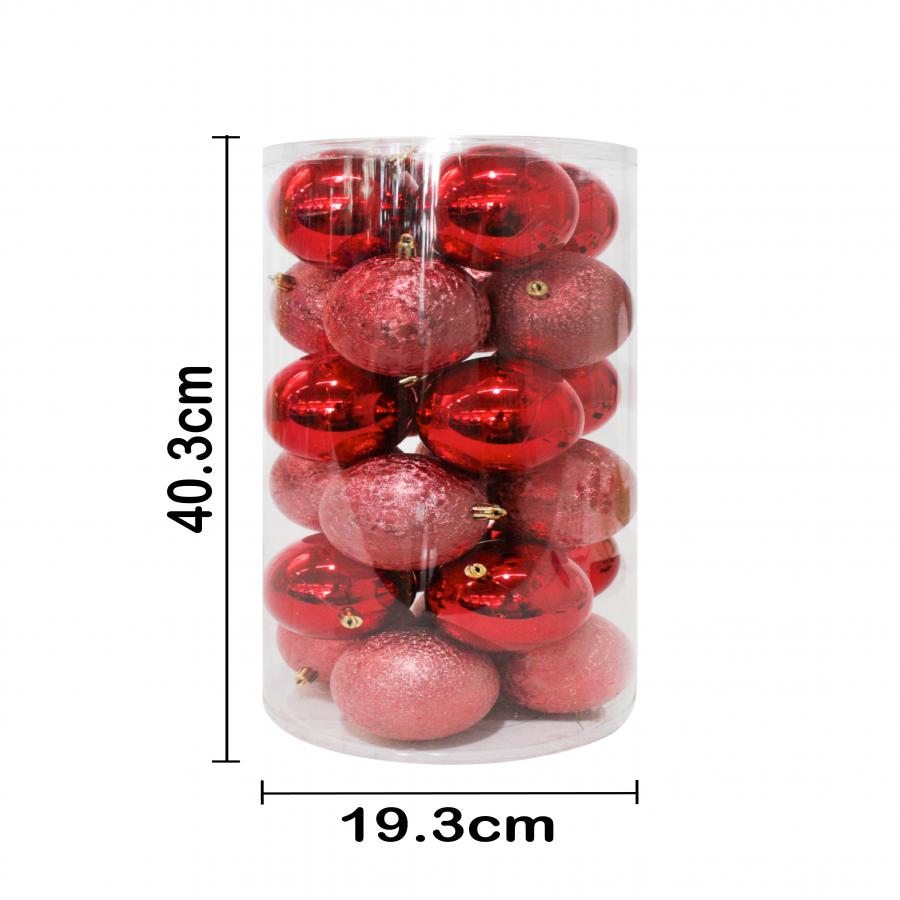 Display de 24 esferas de plástico en color rojo con acabados brillante y mate. Son perfectas para añadir un toque de originalidad y vitalidad a tu árbol. Miden 8cm.