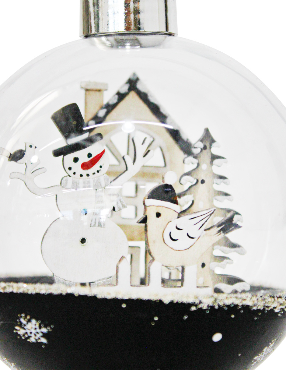 Una elegante Esfera de Acrílico con base negra y figuras de un muñeco de nieve y árbol navideño, con medidas de 10x10x11.5 cm. Ideal para añadir un toque de sofisticación y modernidad.