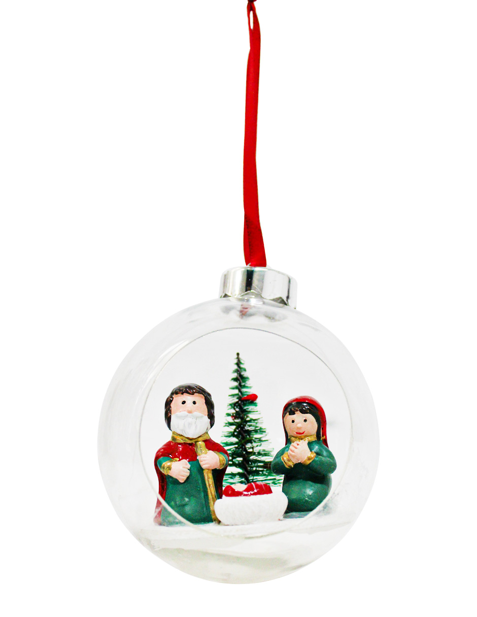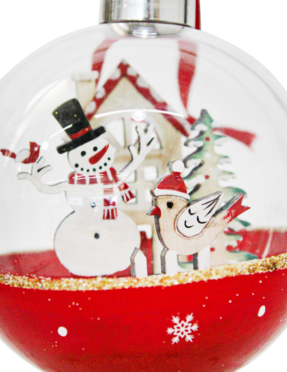 Una festiva Esfera de Acrílico con base roja y figuras de un muñeco de nieve y árbol navideño, con medidas de 10x10x11.5 cm. Ideal para añadir un toque de alegría y tradición.
