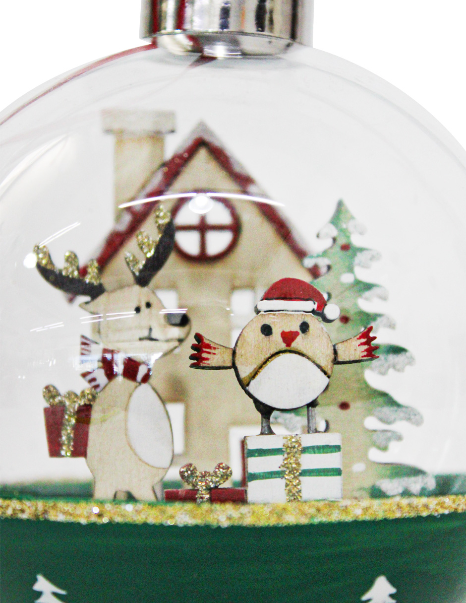 Una encantadora Esfera de Acrílico con base verde y figuras de un reno, pajarito de nieve y casa, con medidas de 10x10x11.5 cm. Ideal para añadir un toque de fantasía y naturaleza.