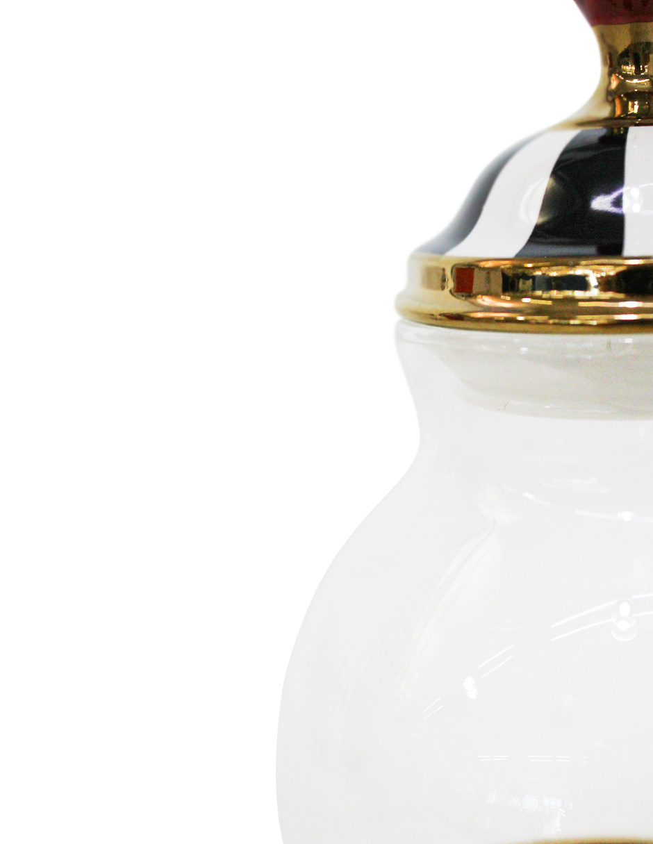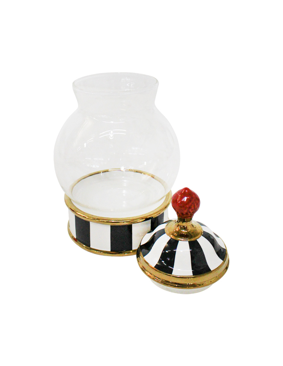 Especiero de vidrio con base y tapa de porcelana diseño rayas negras con blanco y agarradera roja de10x10x20cm