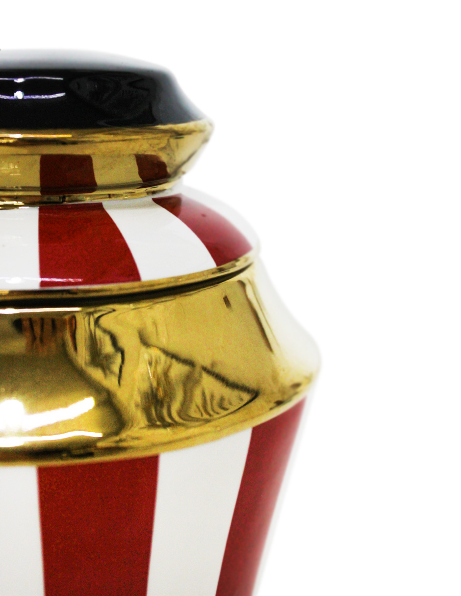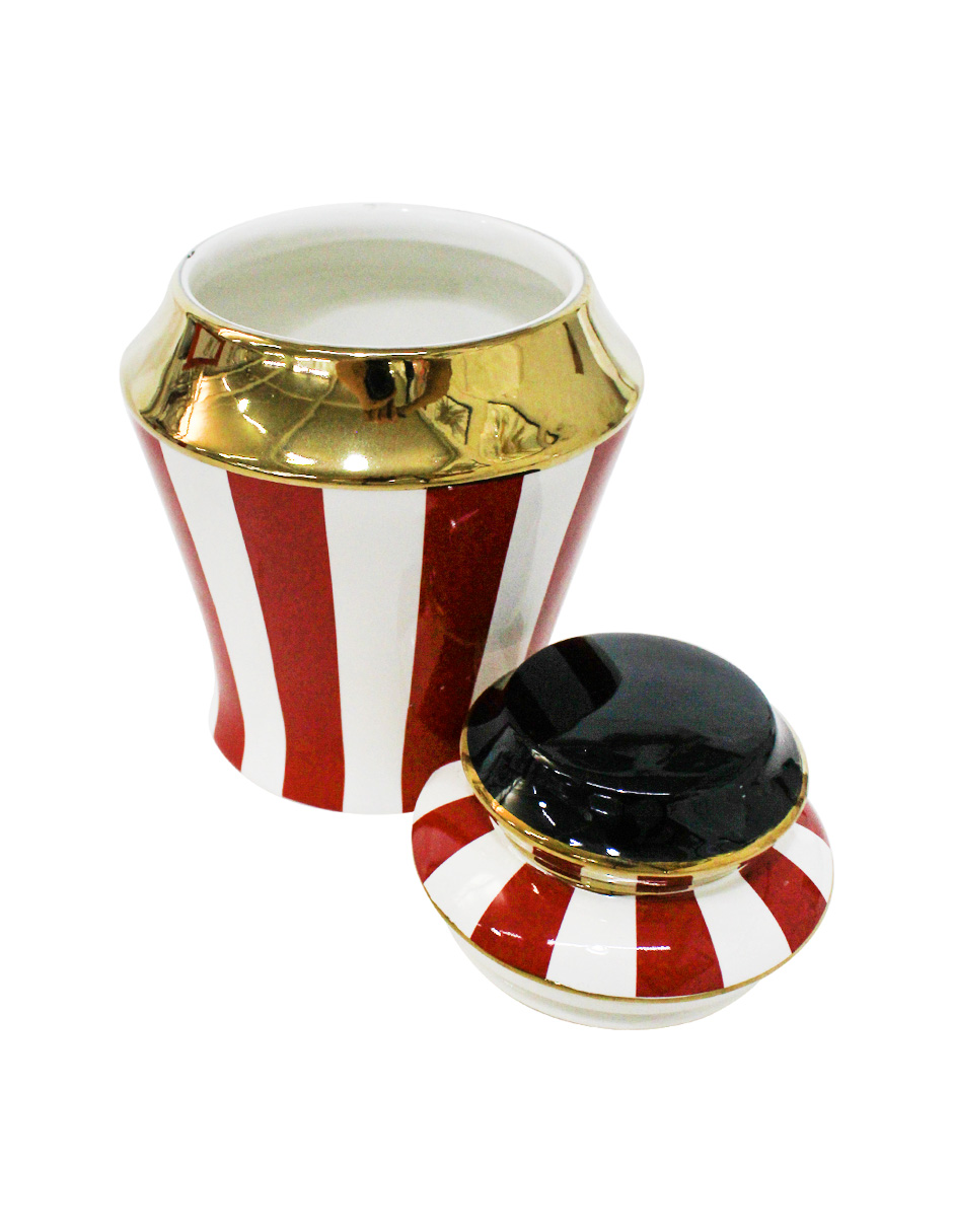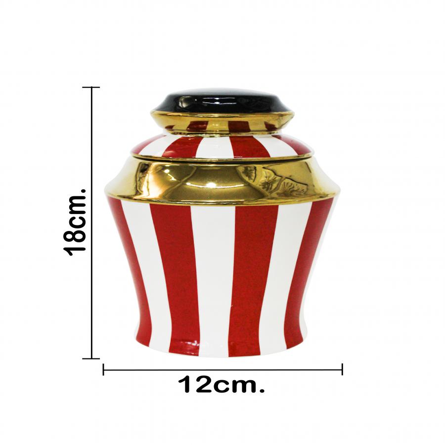 Especiero de porcelana rojo con blanco y dorado de 13x13x18 cm