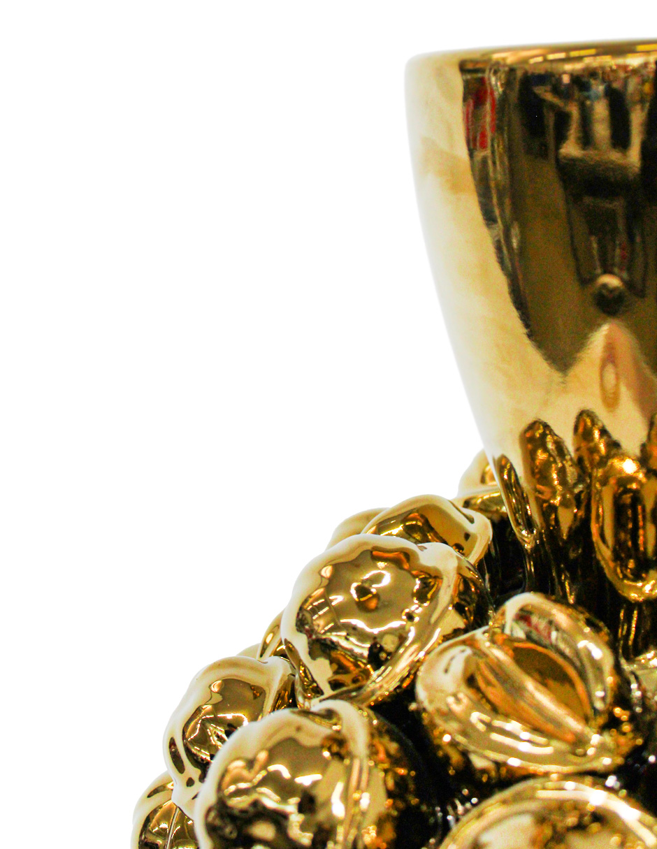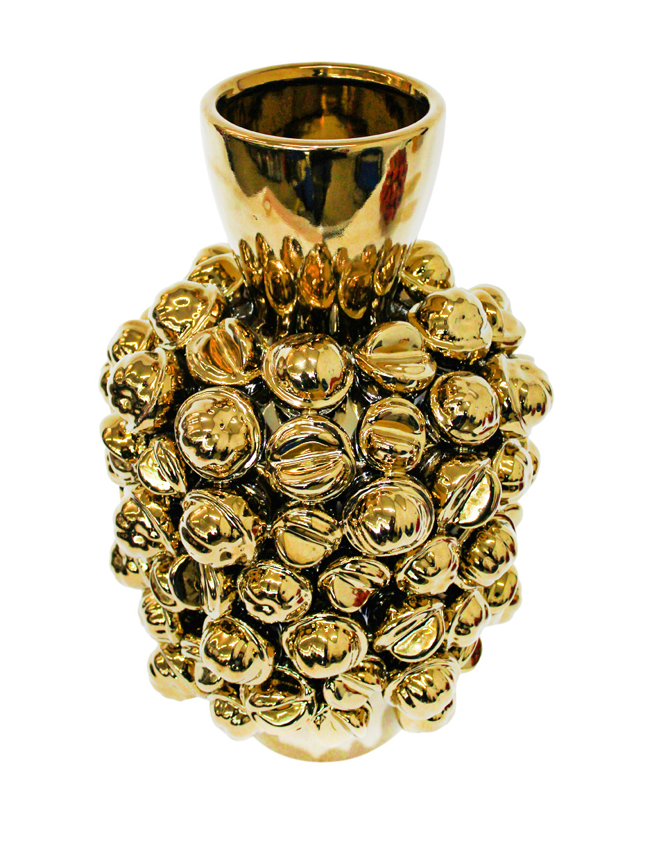 Dale un hogar a tus flores con un toque de lujo. Este florero de porcelana dorado con nueces es perfecto para embellecer tu espacio, añadiendo un acento sofisticado y moderno. Su diseño te hará sentir la opulencia y la distinción. Mide 30x30x47.5cm.