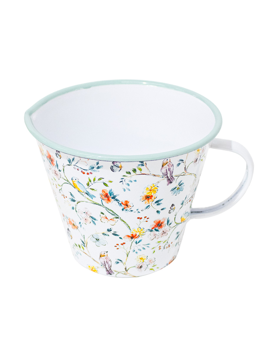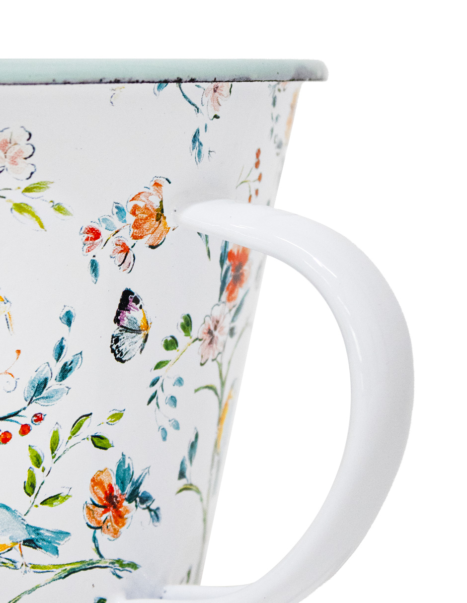 Sirve tus bebidas con un toque rústico. Esta jarrita de peltre blanca con estampado de flores es perfecta para tu mesa. Su diseño te hará sentir la calidez y la autenticidad de la vida en el campo. Mide 15x15x12cm.