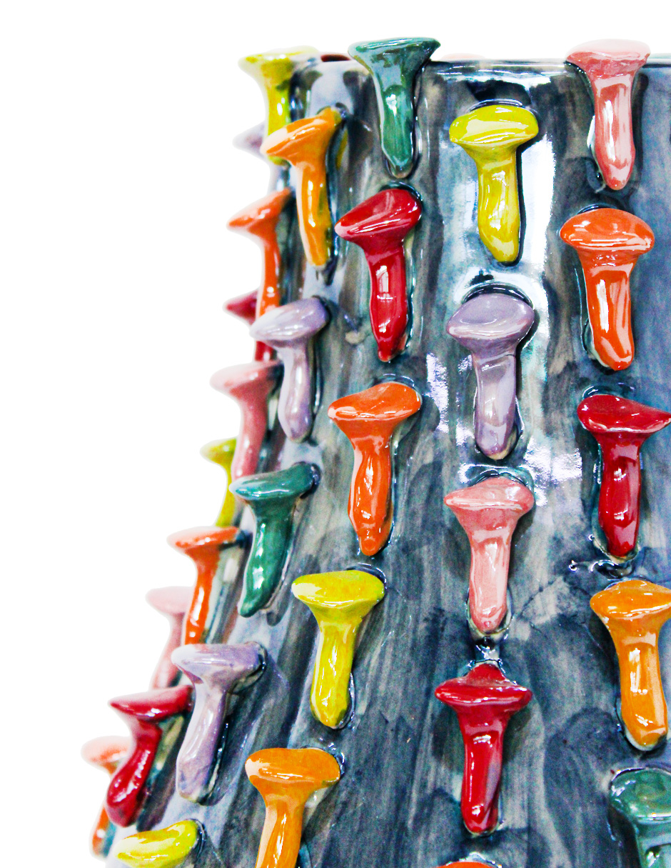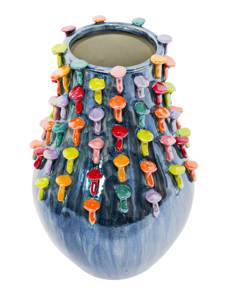 Dale un toque de originalidad y color a tu espacio. Este jarrón azul con diseño de hongos de colores es perfecto para embellecer tu hogar, añadiendo un acento único y divertido. Su diseño te hará sentir la creatividad y la alegría. Mide 18.7×18.7x28cm.