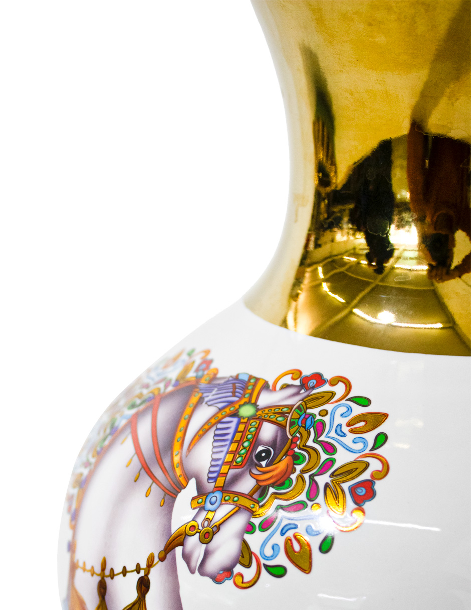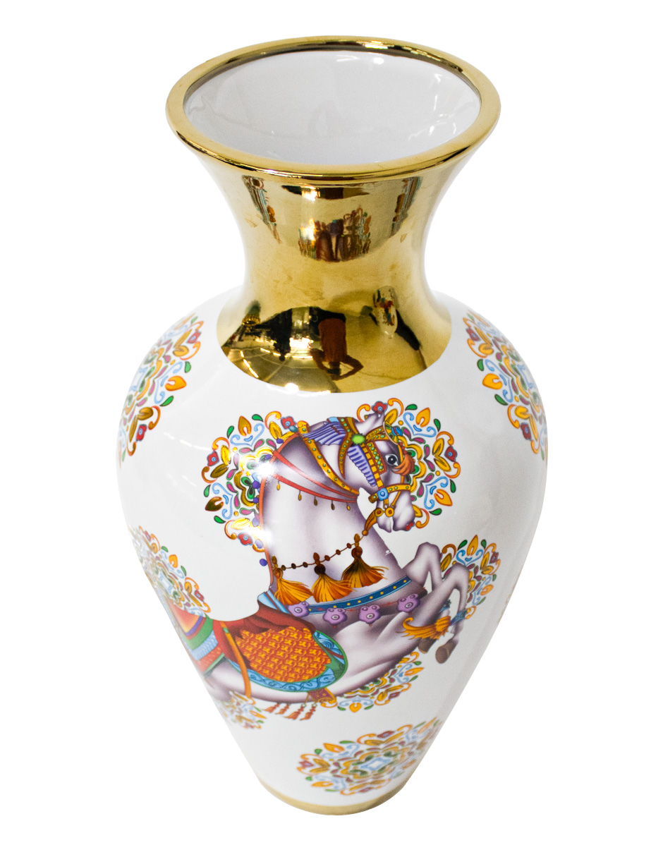 Dale un toque de lujo a tu espacio. Este jarrón de porcelana blanco con dorado y caballo de colores es perfecto para embellecer tu hogar, añadiendo un acento sofisticado. Su diseño te hará sentir la opulencia y la distinción. Mide 18x18x36cm.