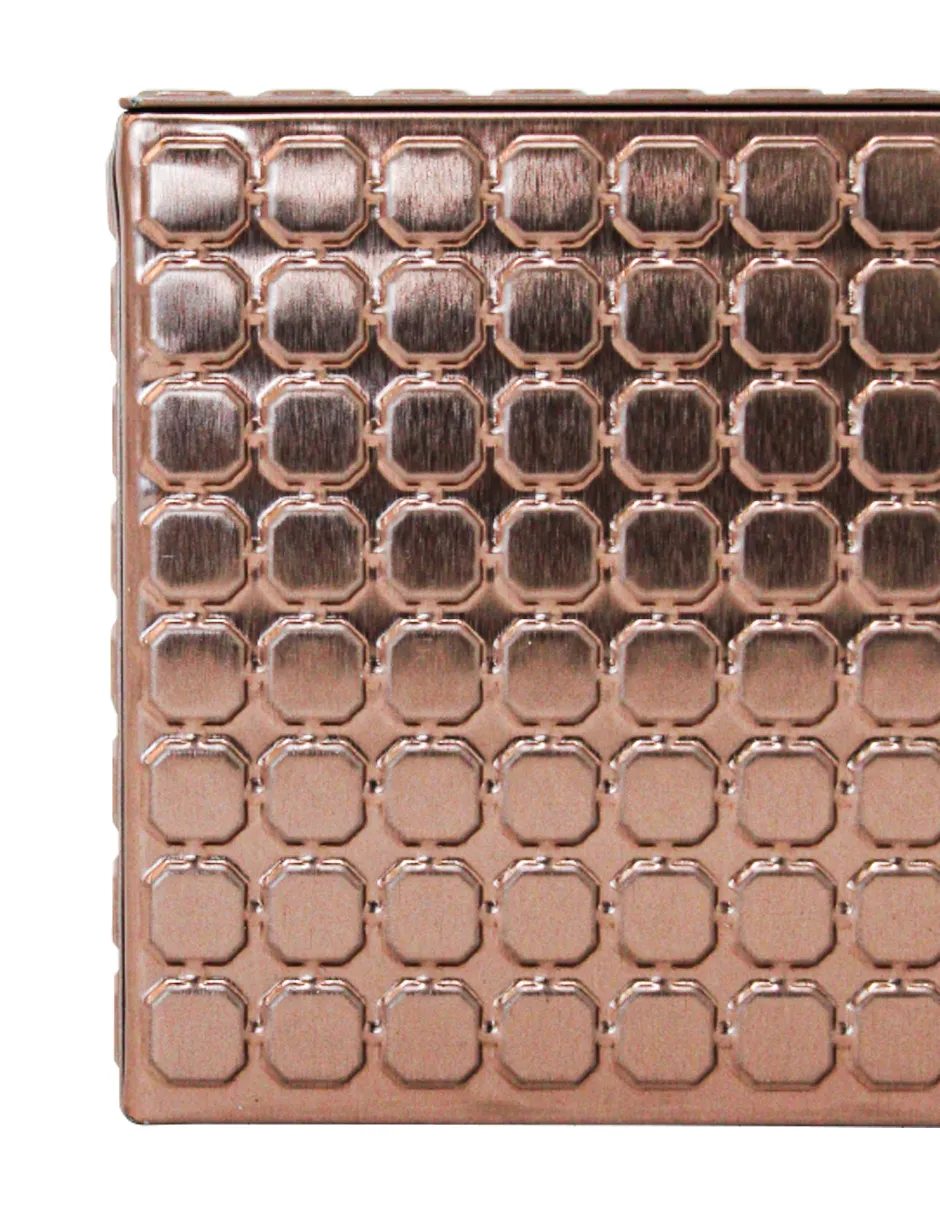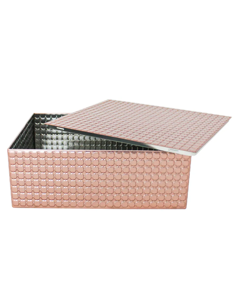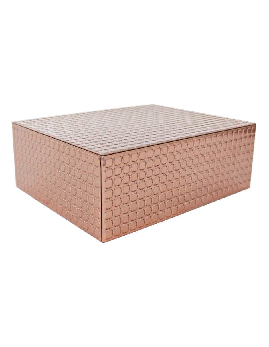 Dale un toque de modernidad a tu hogar. Este juego de 2 cajas rectangulares de lámina con diseño de cadenas cobre es perfecto para guardar tus objetos. Su diseño te hará sentir la organización y la sofisticación. Mide 17/6.4×24/22×8.8×6.4cm.