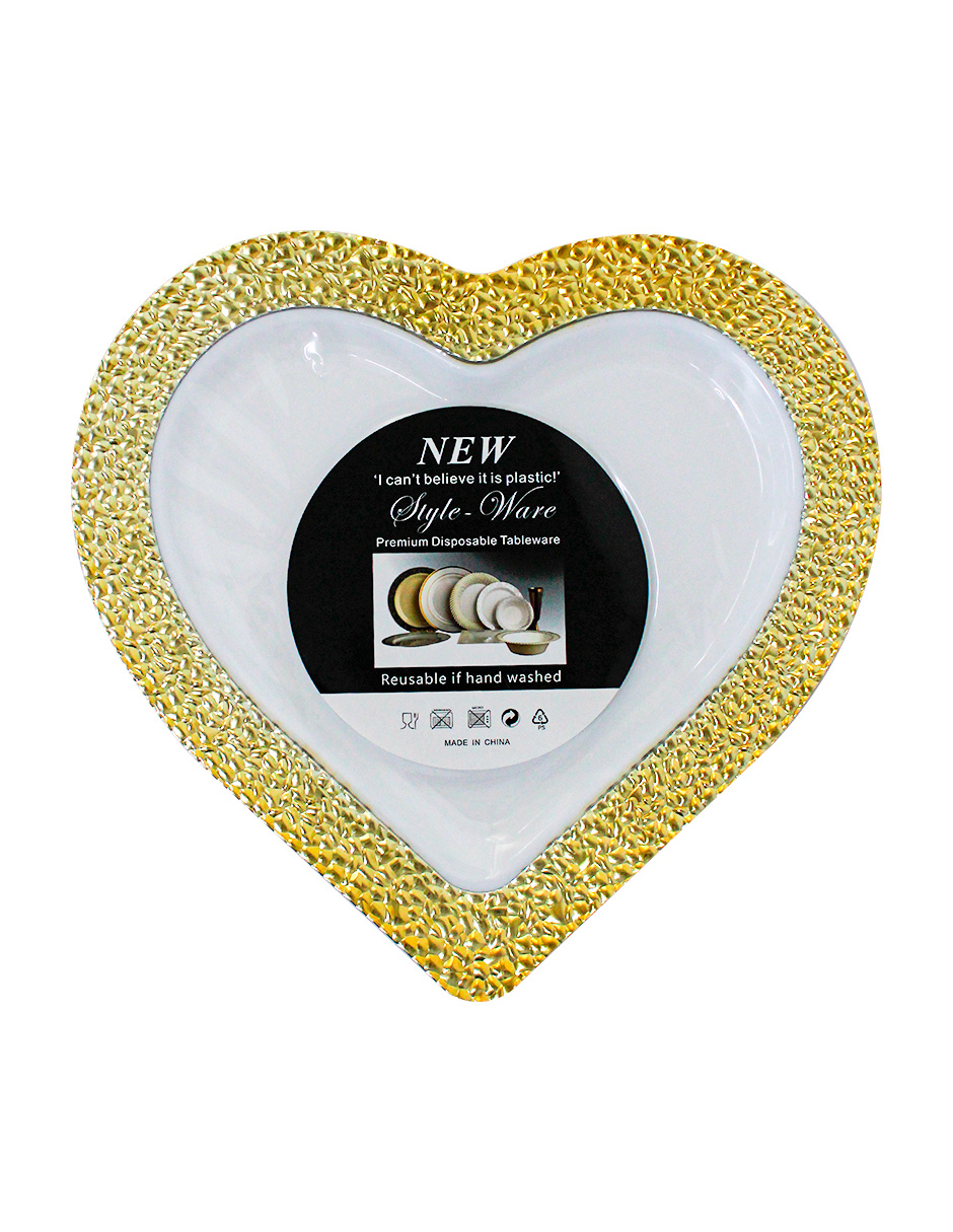 Juego de 3 platos blancos con orilla dorada de plastico diseño corazon de 25.4cm