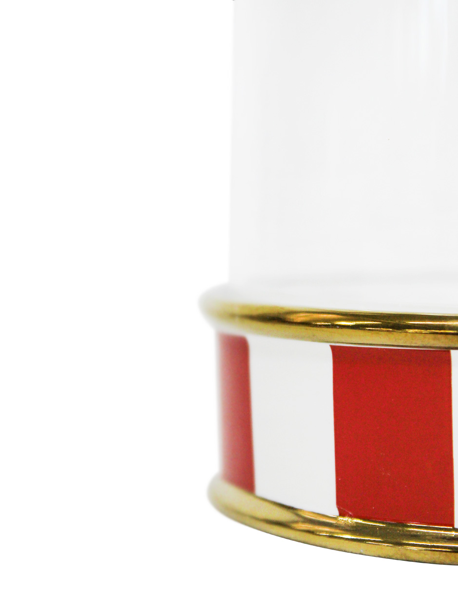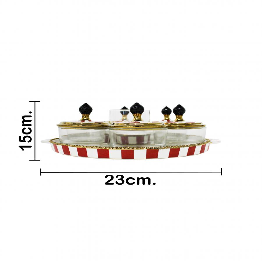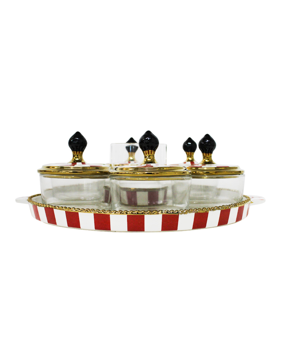 Juego de 6 frascos de porcelana y vidrio con tapa y charola rojo con blanco de 9x9x10 cm