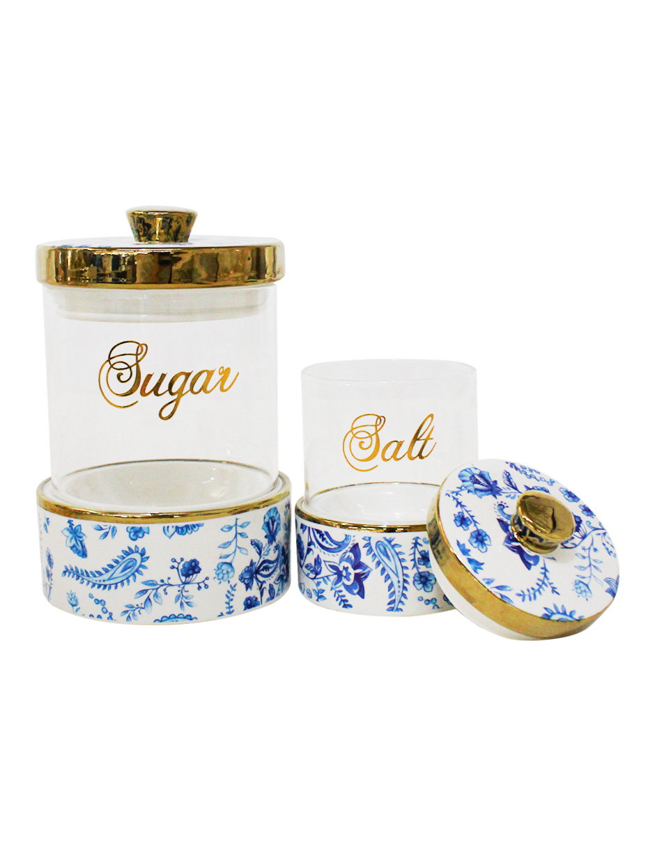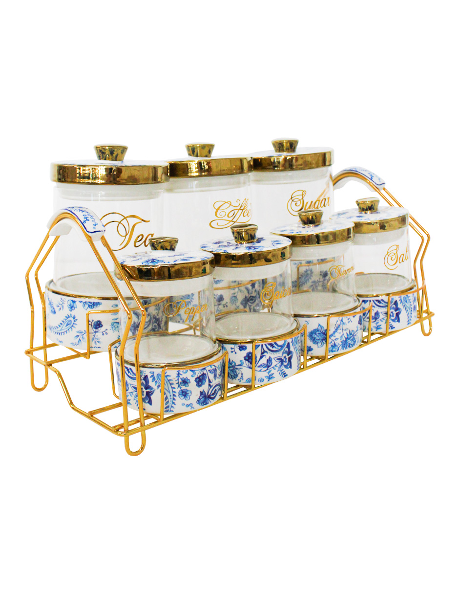 Juego de 7 especieros de porcelana con vidrio y tapa azul con blanco y base de metal de 11x11x17 cm