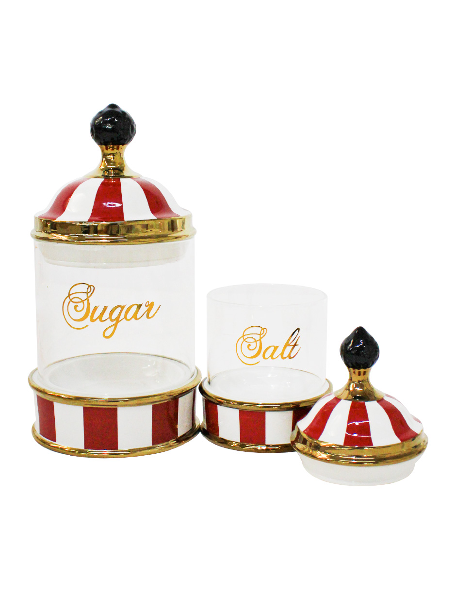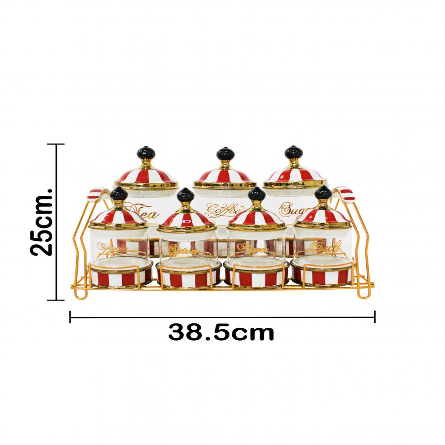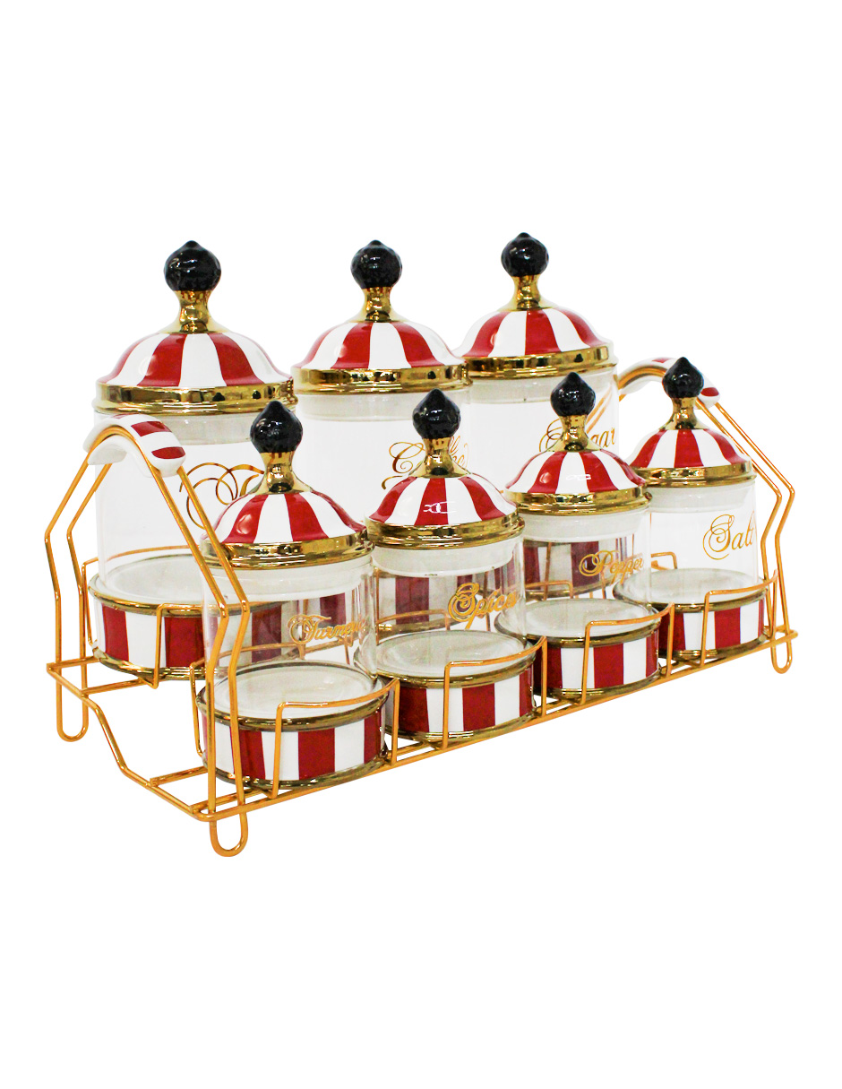 Juego de 7 especieros de porcelana con vidrio y tapa rojo con blanco y base de metal de 11x11x16 cm
