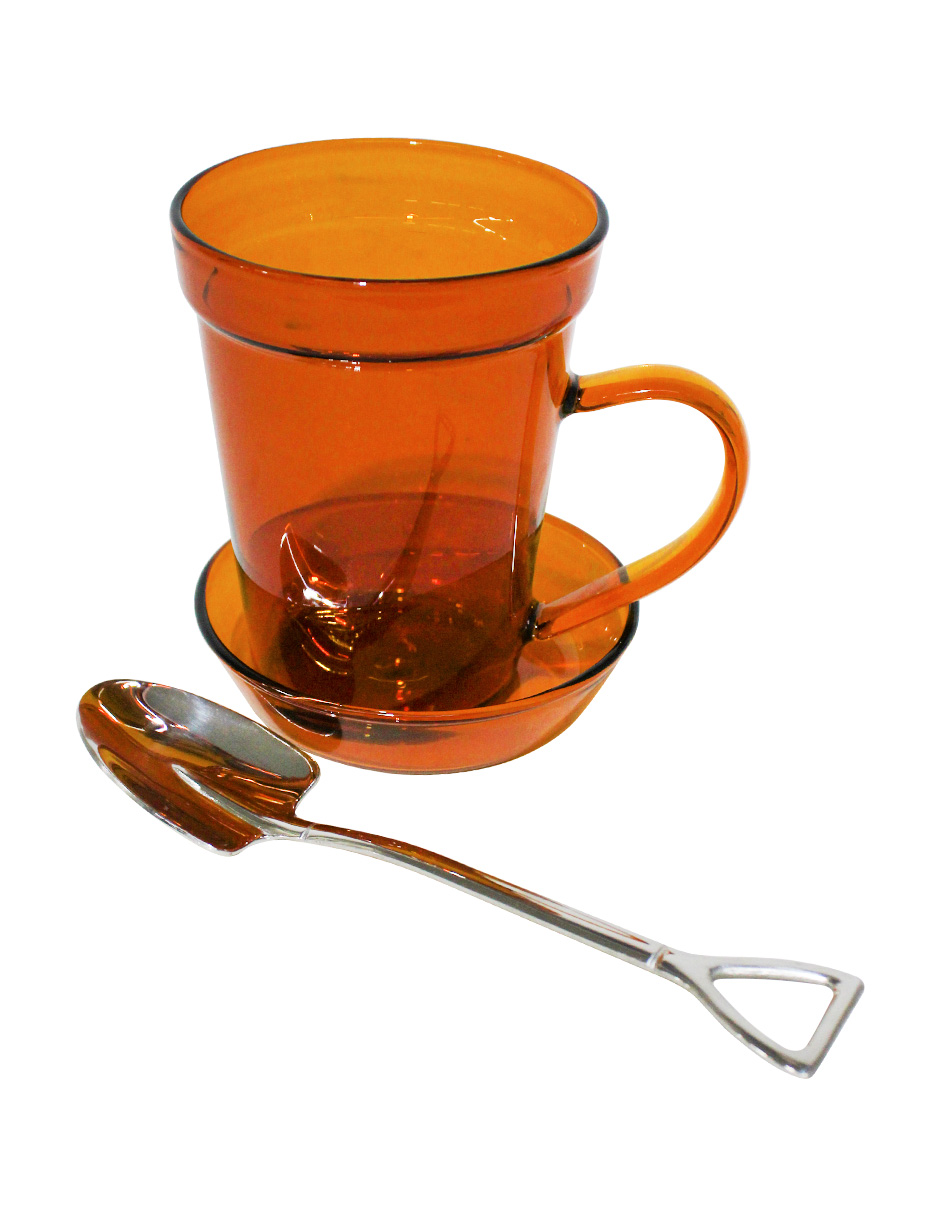 Taza con plato de vidrio ámbar y cuchara tipo pala de 300 ml