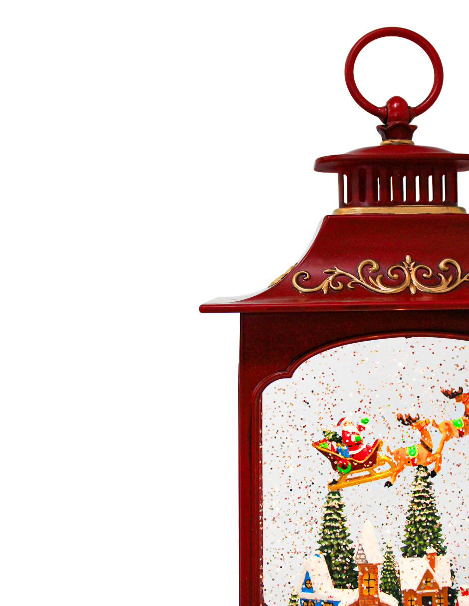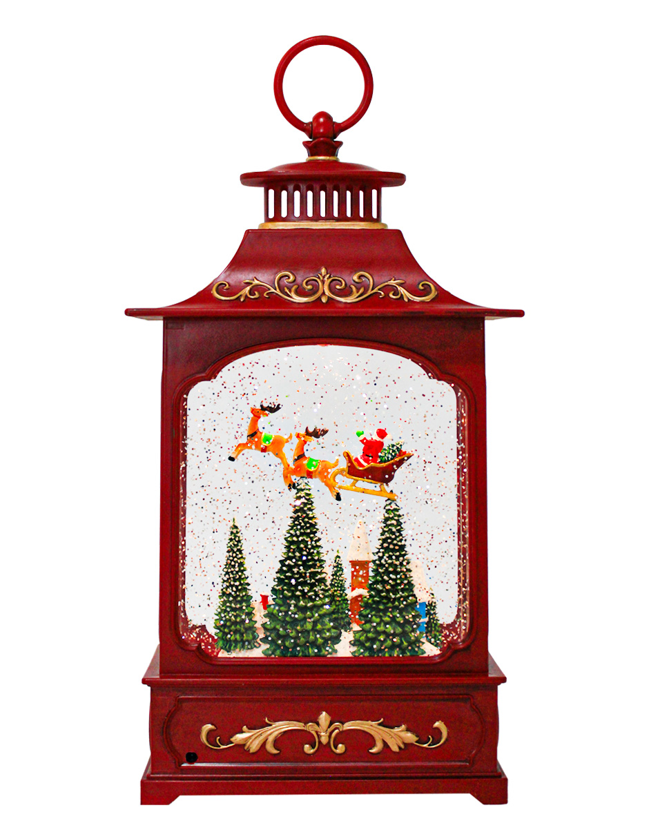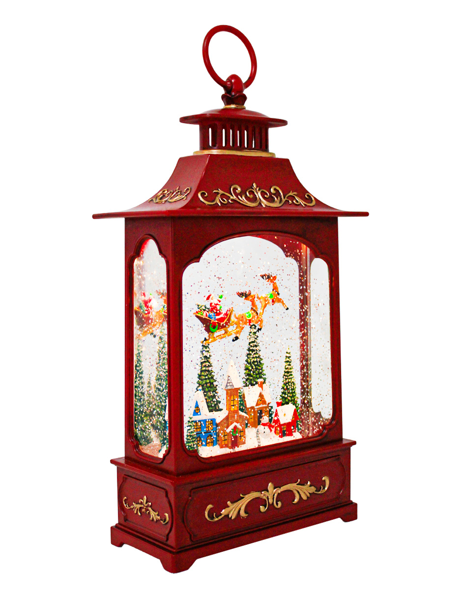 Esta elegante linterna de plástico con acabado rojo es una decoración navideña encantadora. Con unas medidas de 17.5×8.5x35cm, en su interior se ilumina con luz LED y presenta una escena detallada de Santa en su trineo. También es musical y puede ser alimentada por un cable USB o 3 pilas AA (no incluidas), creando un ambiente acogedor y mágico.