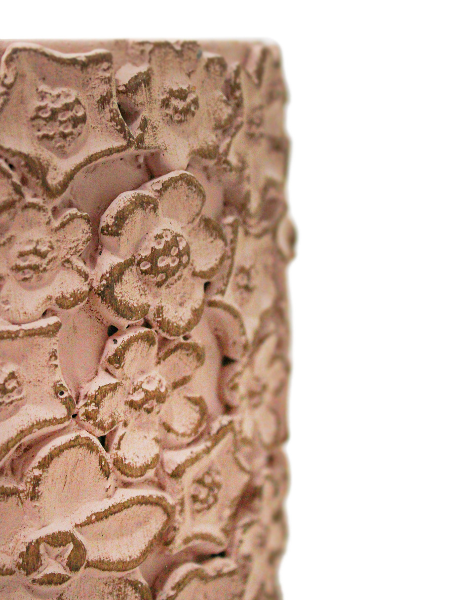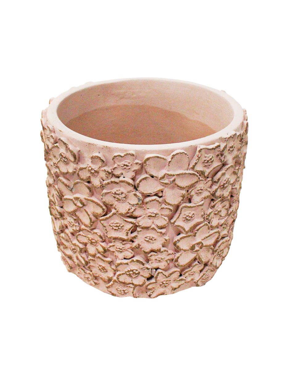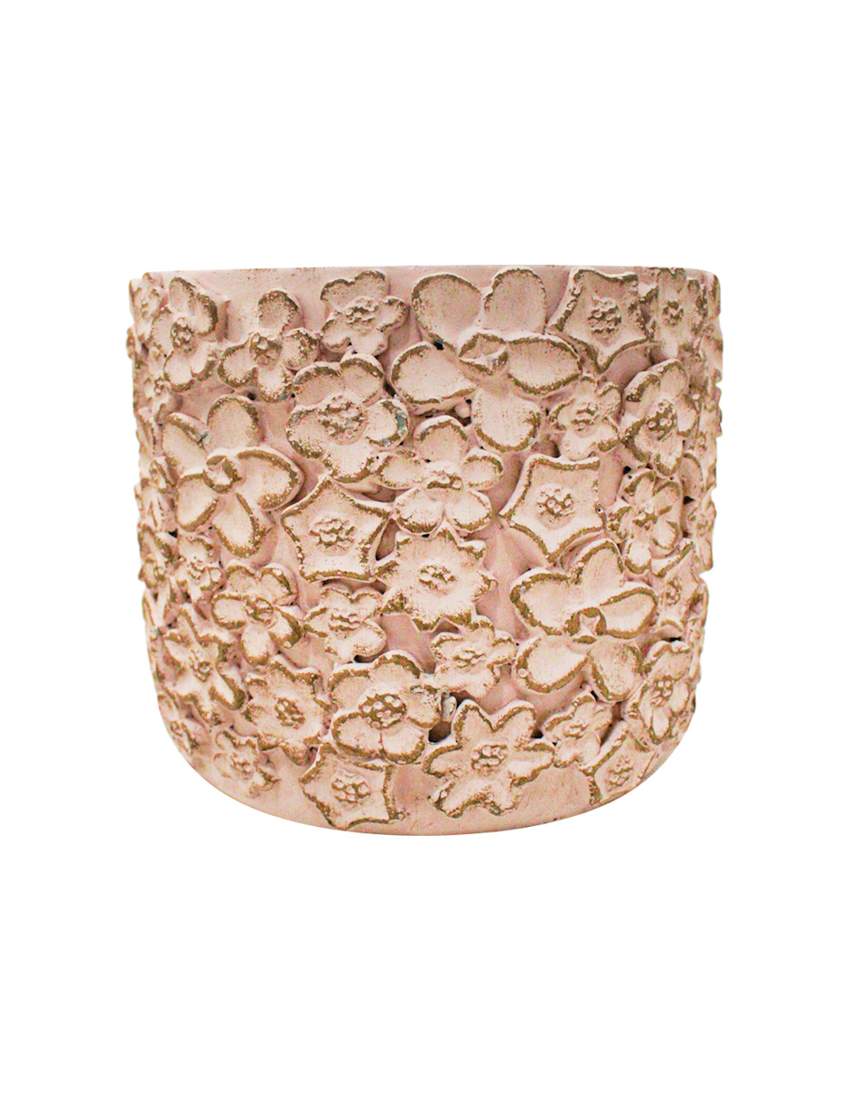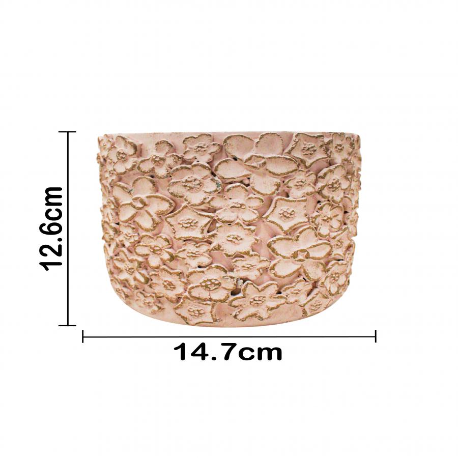 Maceta de cemento rosa con diseño flores de 15x15x13cm