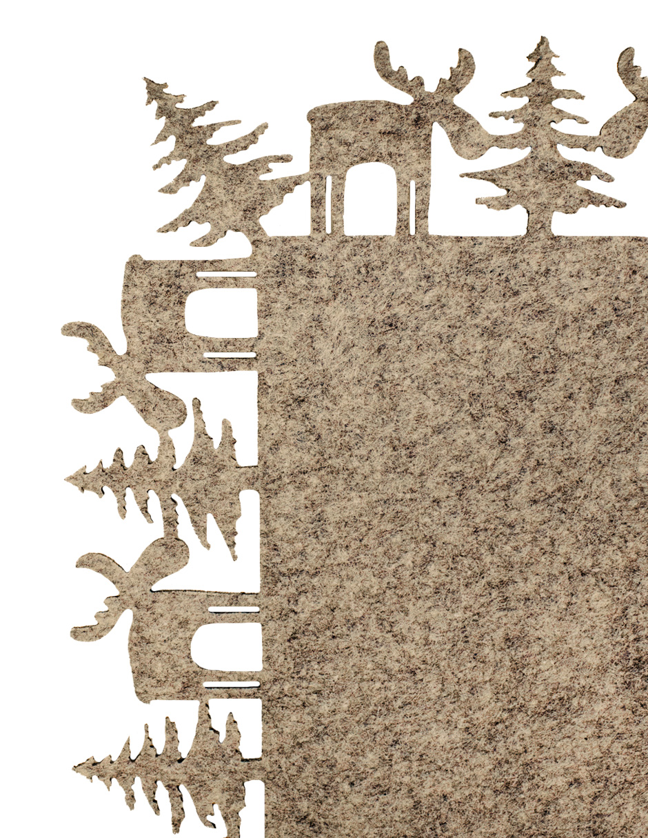 Un delicado mantel rectangular de fieltro beige con una orilla de renos y pinos, con medidas de 40×30 cm. Ideal para proteger tus superficies con un toque de calidez y encanto.