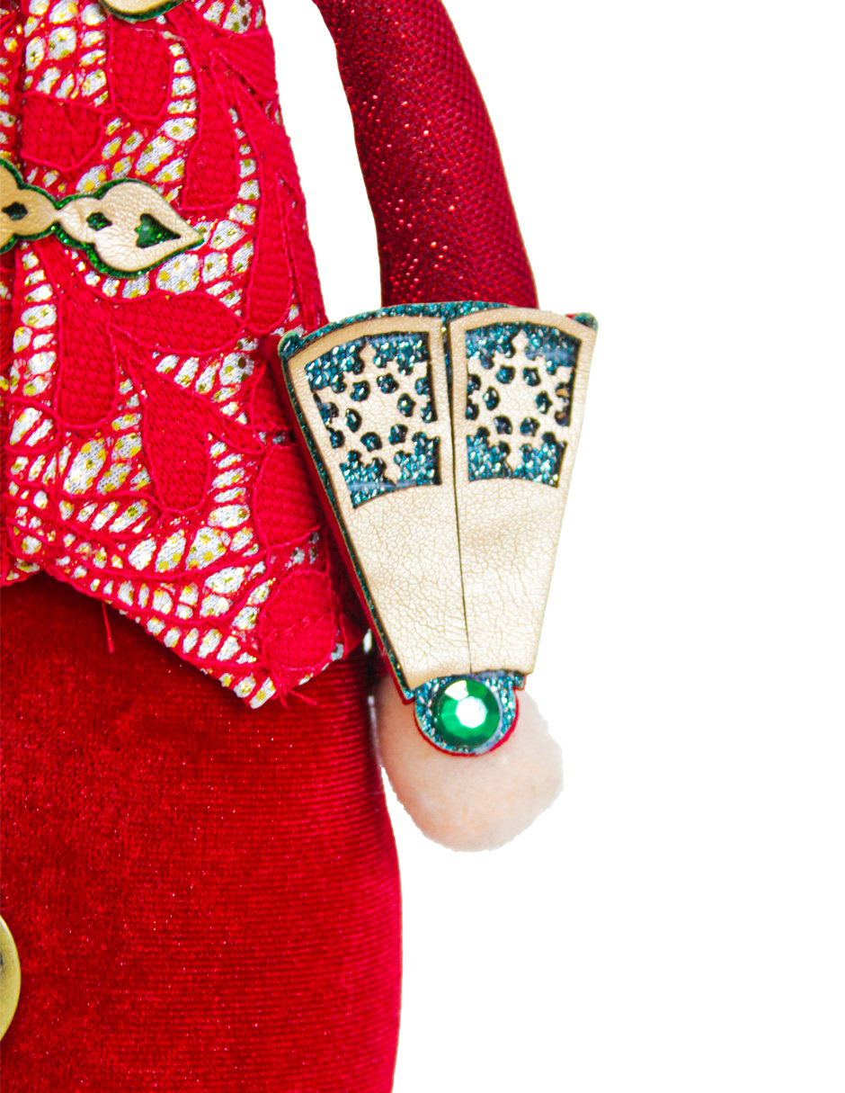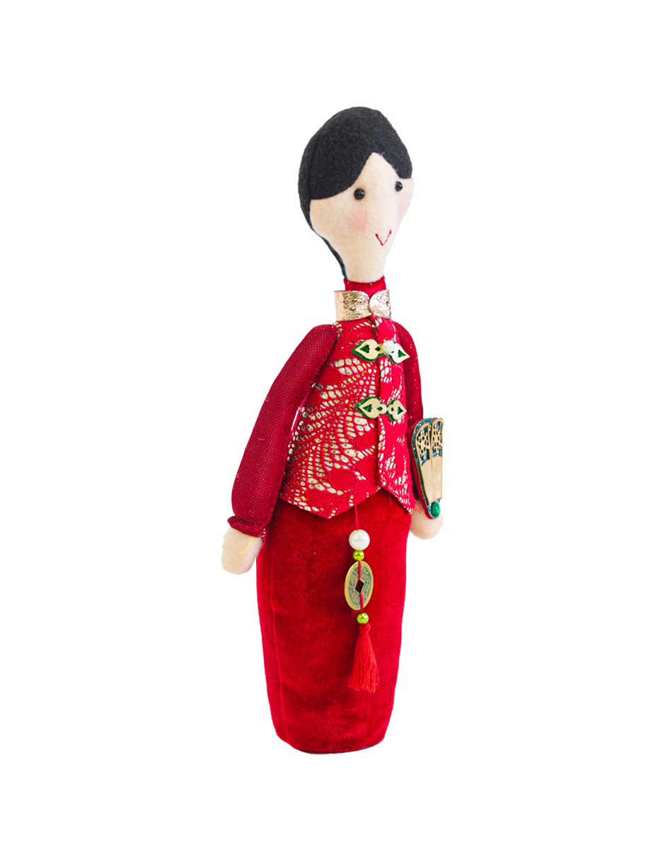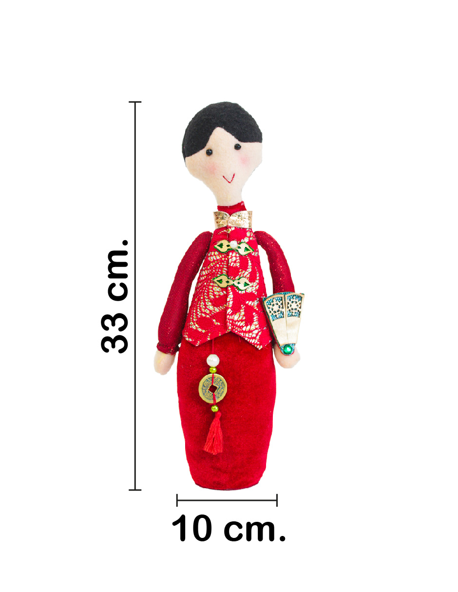 Muñeca estilo oriental de tela con vestido rojo sosteniendo letra china de 33x10cm – Este producto puede presentar diversos detalles tanto estéticos como en su empaque y por ningún motivo es aplicable la devolución y/o reembolso del mismo.