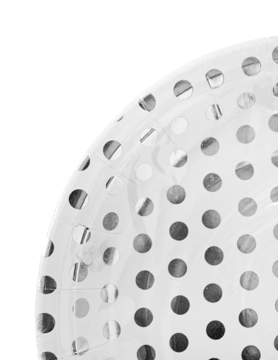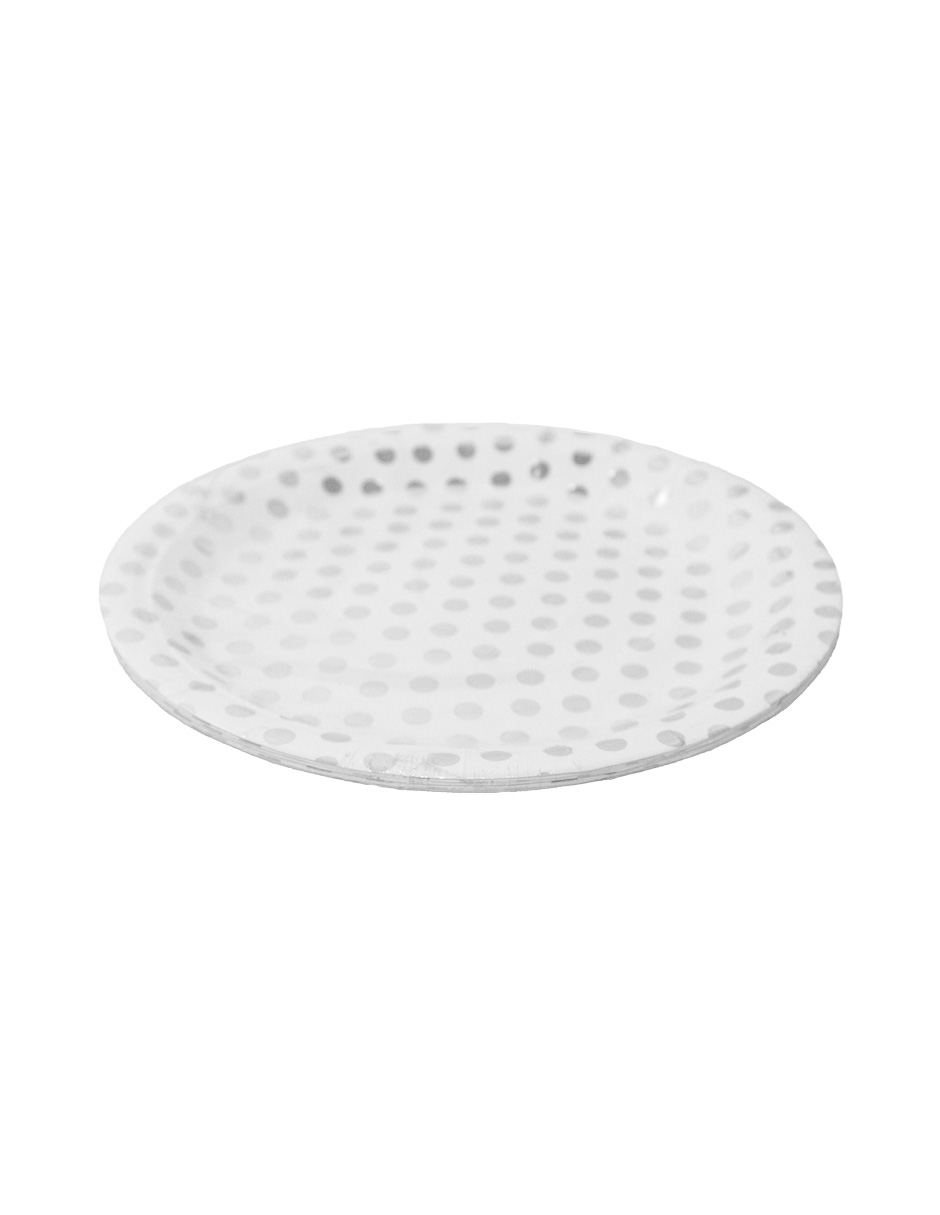 Paquete de 10 piezas de plato desechable blanco con puntos plateados de 23cm