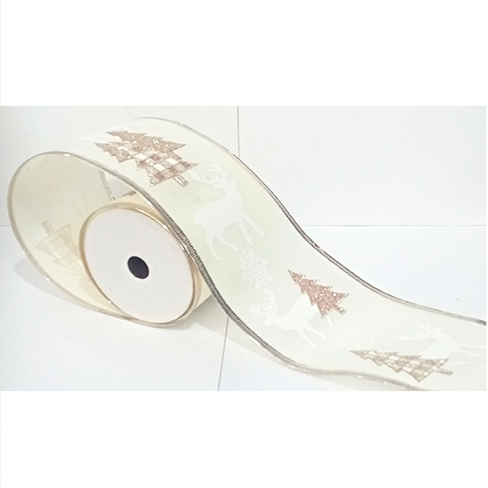 Rollo de listón de tela marfil con venados y árboles dorados de 10cmx10m