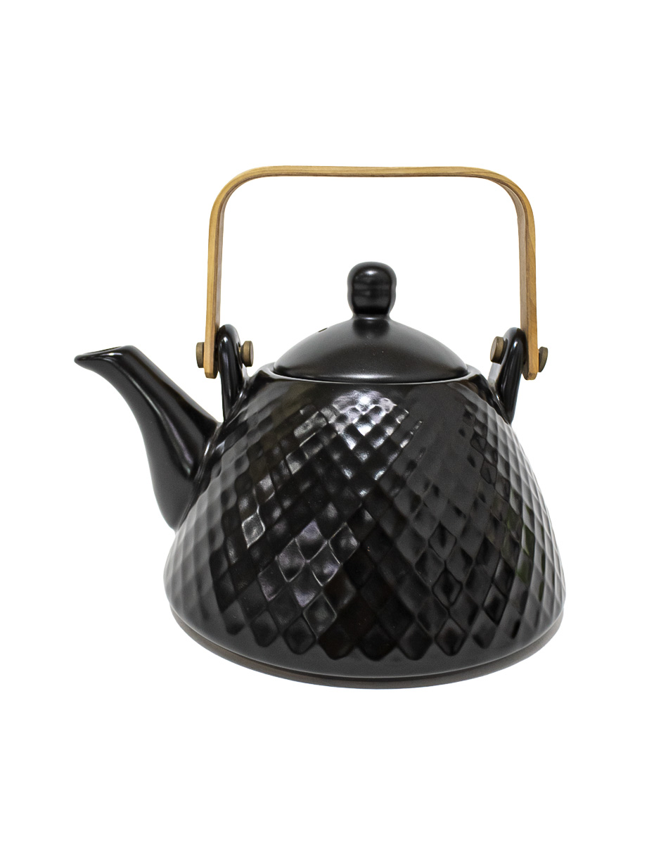 Tetera de cerámica negra diseño triángulos con agarradera de madera de 18.5x15x12.5 cm