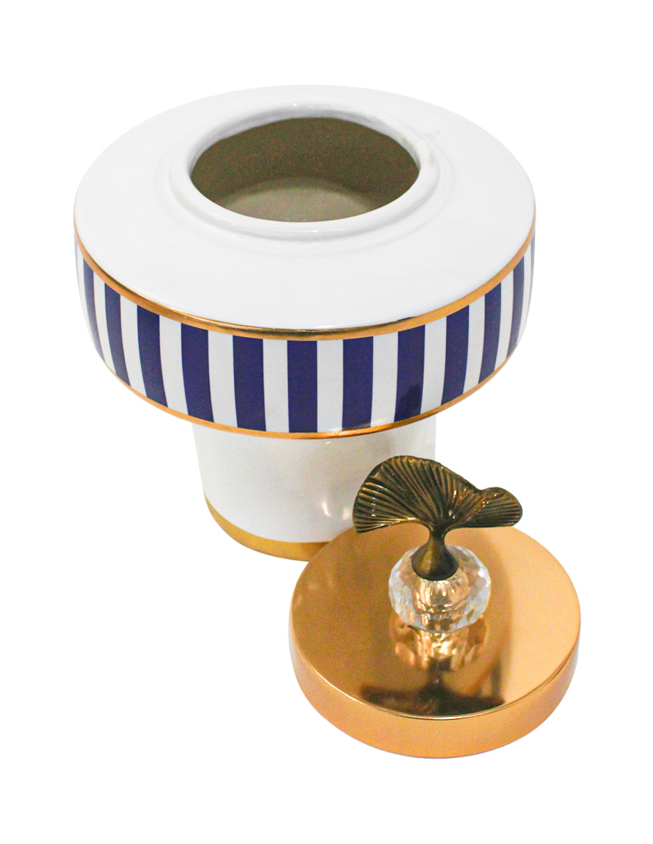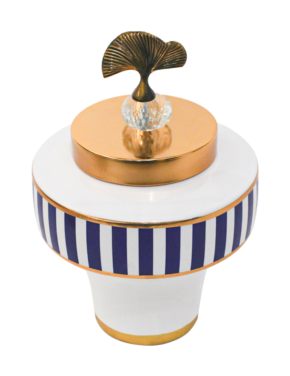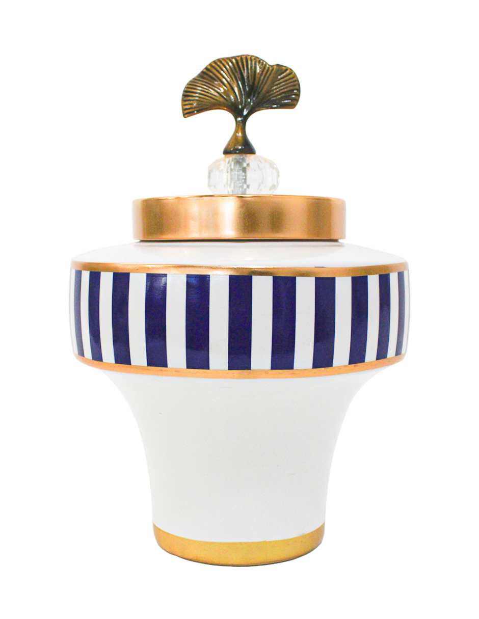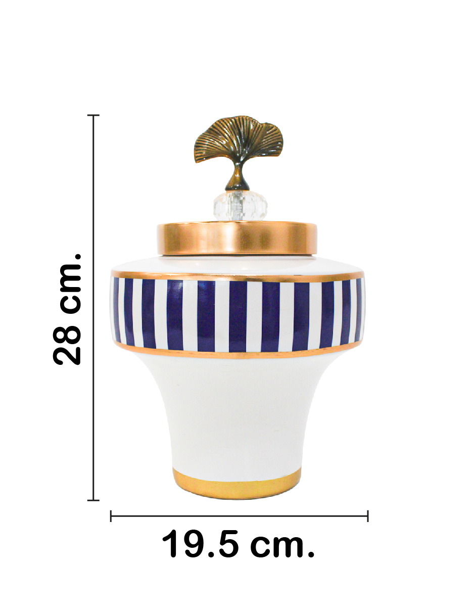 Tibor de cerámica con rayas negro con blanco y tapa dorada de 17.5×17.5x26cm