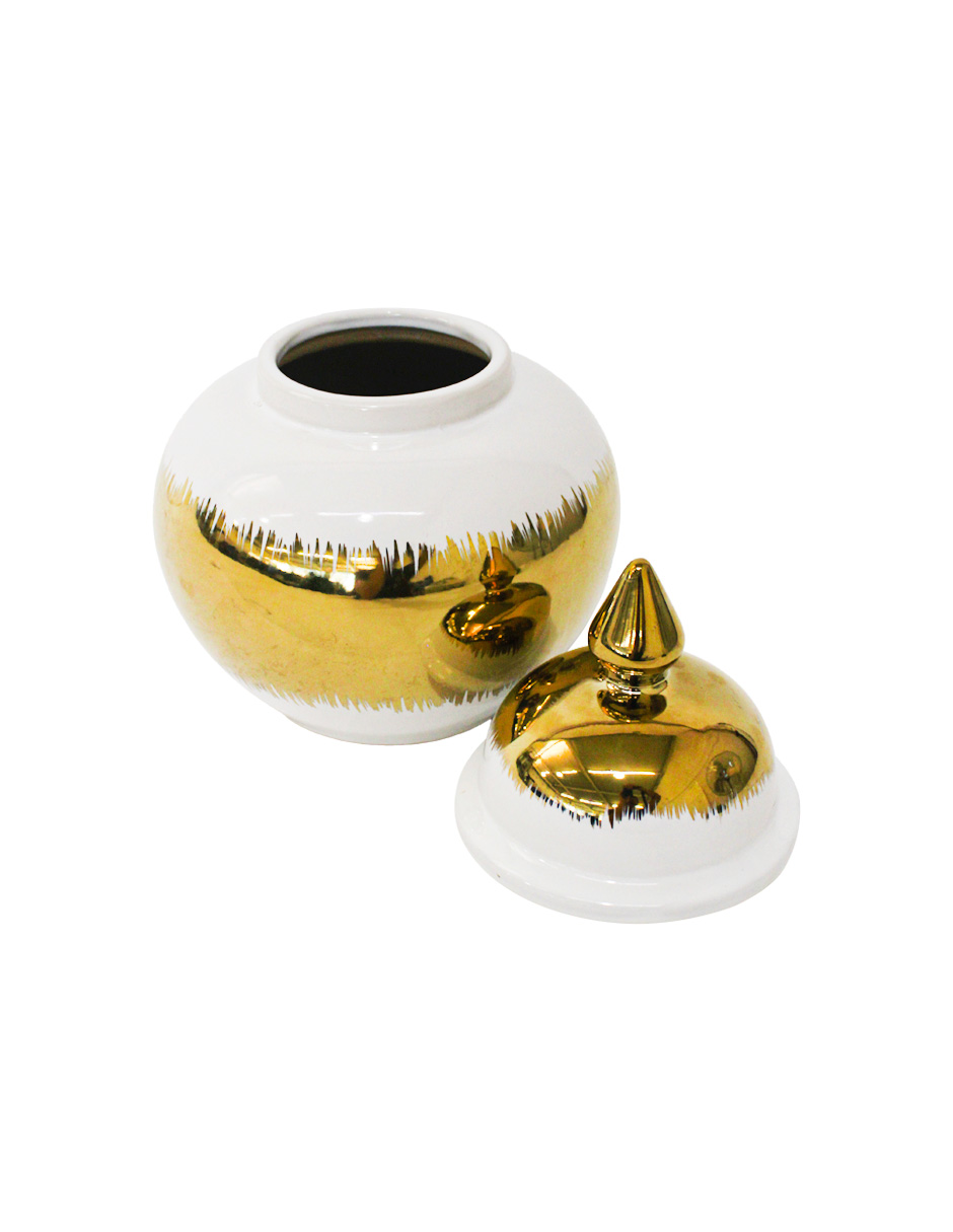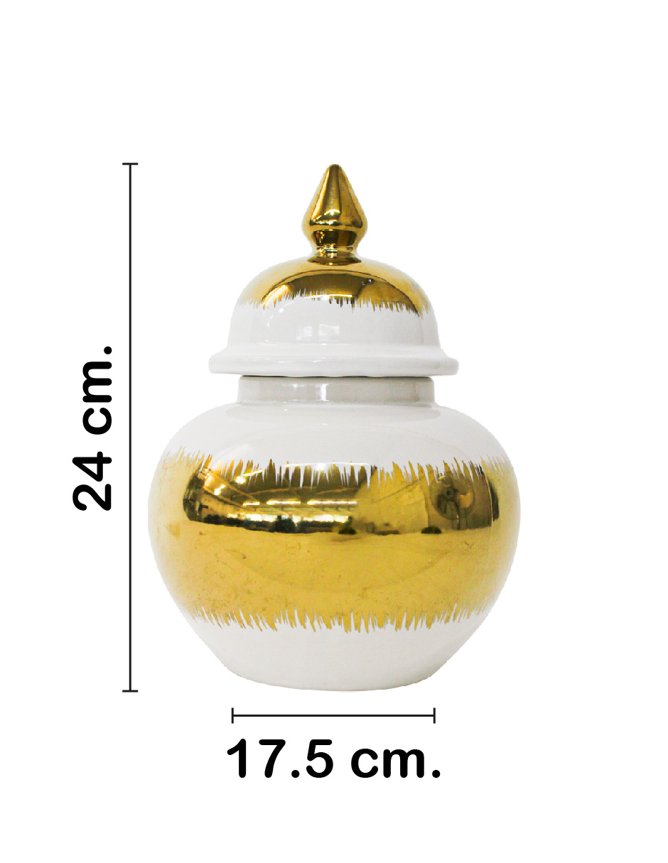 Tibor de cerámica dorado con blanco y tapa dorada de 17.5×17.5x24cm
