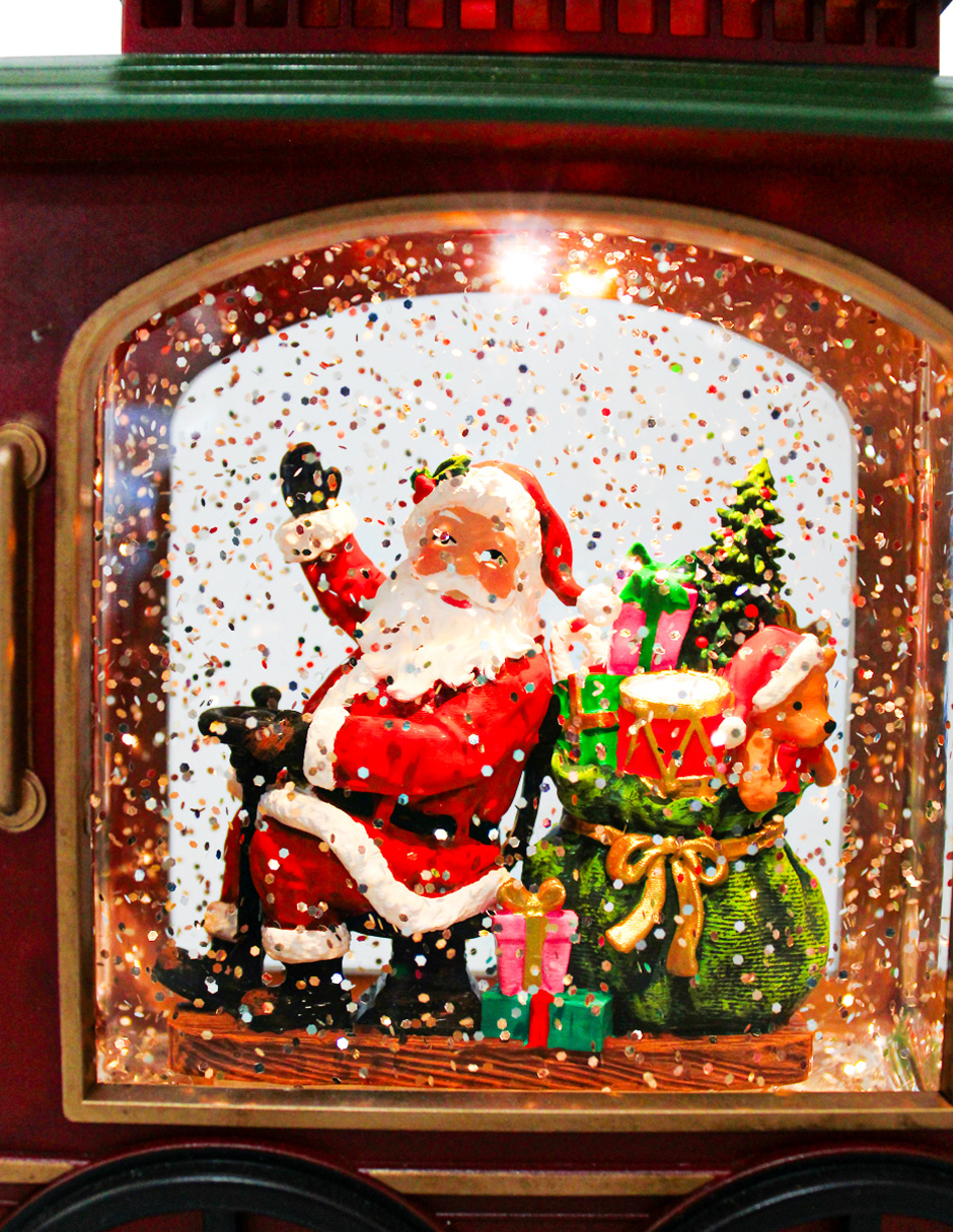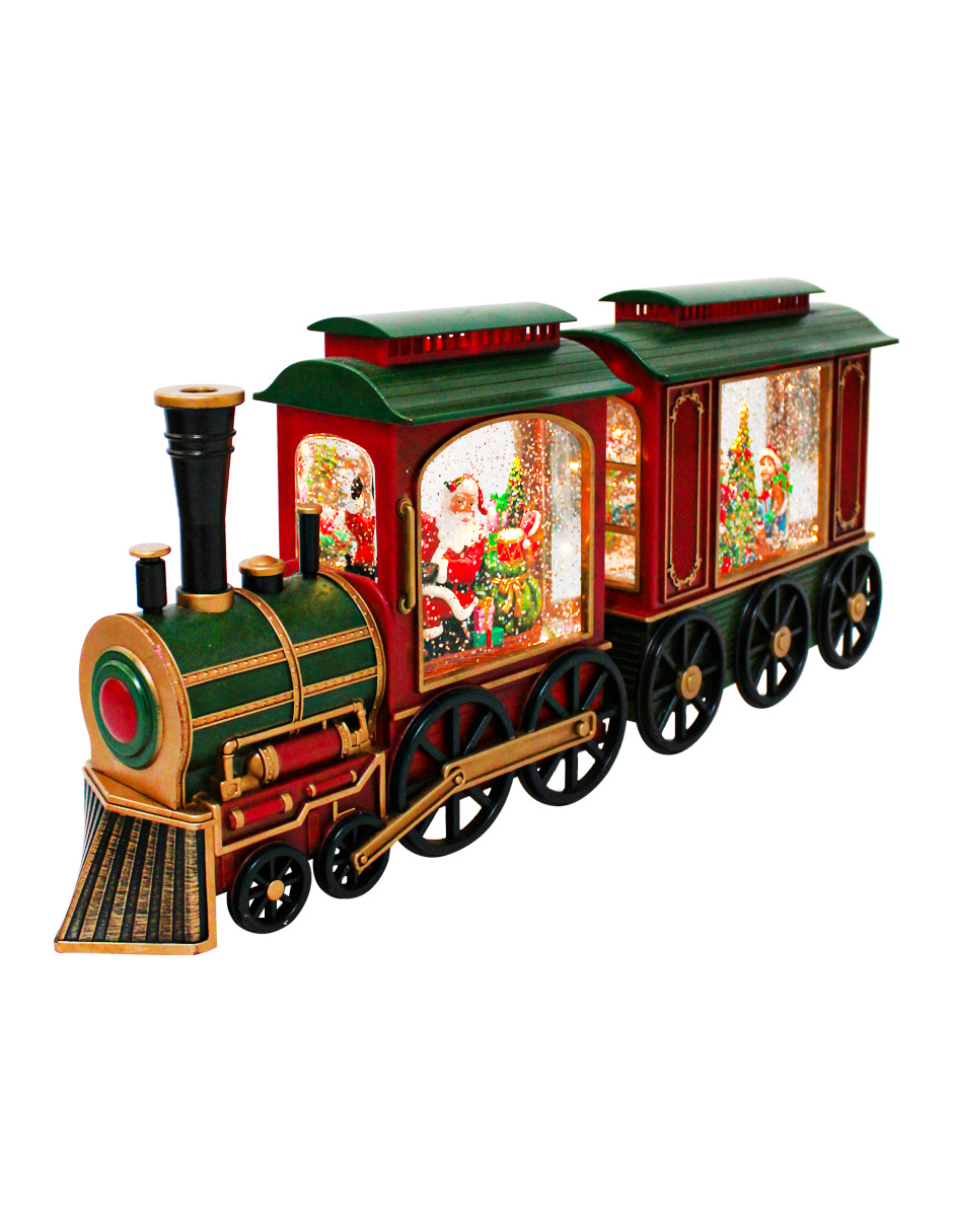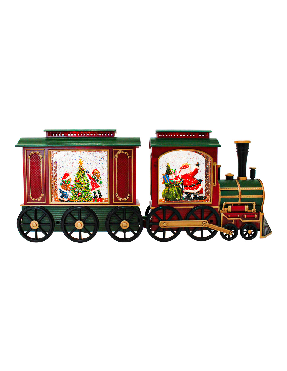 Un festivo tren navideño de poliresina que trae a Santa y un árbol de Navidad a tu hogar. Con medidas de 48x9x19.8cm, esta pieza incorpora luz y movimiento, haciendo que la escena cobre vida. Funciona con baterías 3AA (no incluidas). Es el adorno ideal para mesas o bajo el árbol, despertando la ilusión en grandes y pequeños.