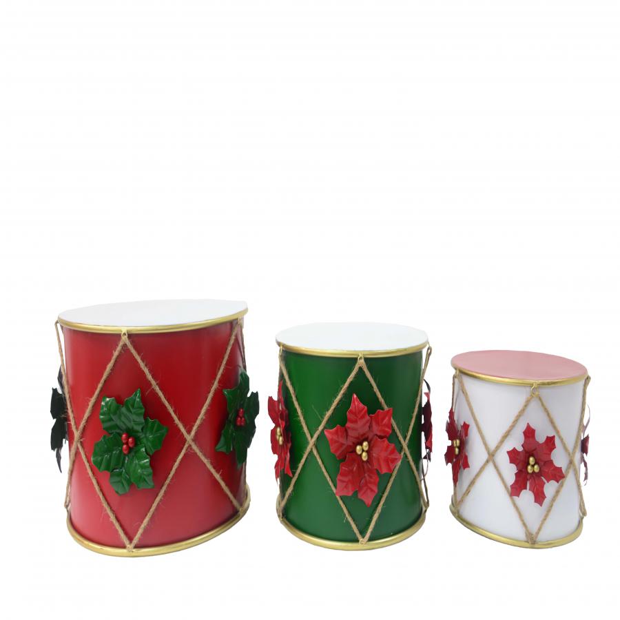 Un toque de magia y fantasía para la temporada. Este juego de 3 tambores de metal con diseño de traje de Santa es la pieza perfecta para decorar tu hogar en la temporada festiva. Su diseño lleno de detalles evoca alegría y calidez.