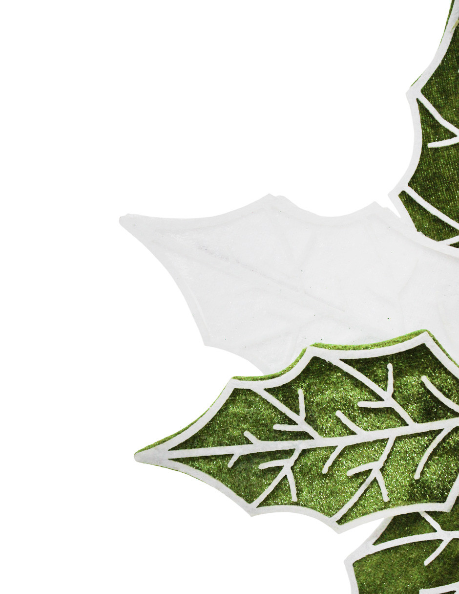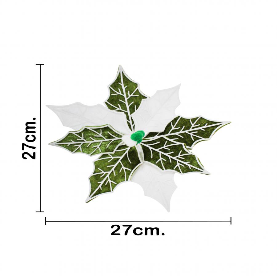Vara de Nochebuena de terciopelo en una elegante combinación de colores blanco y verde. Es perfecta para añadir un toque de pureza y naturaleza a tus arreglos florales o coronas navideñas. Medidas: 28x21x0.1cm.
