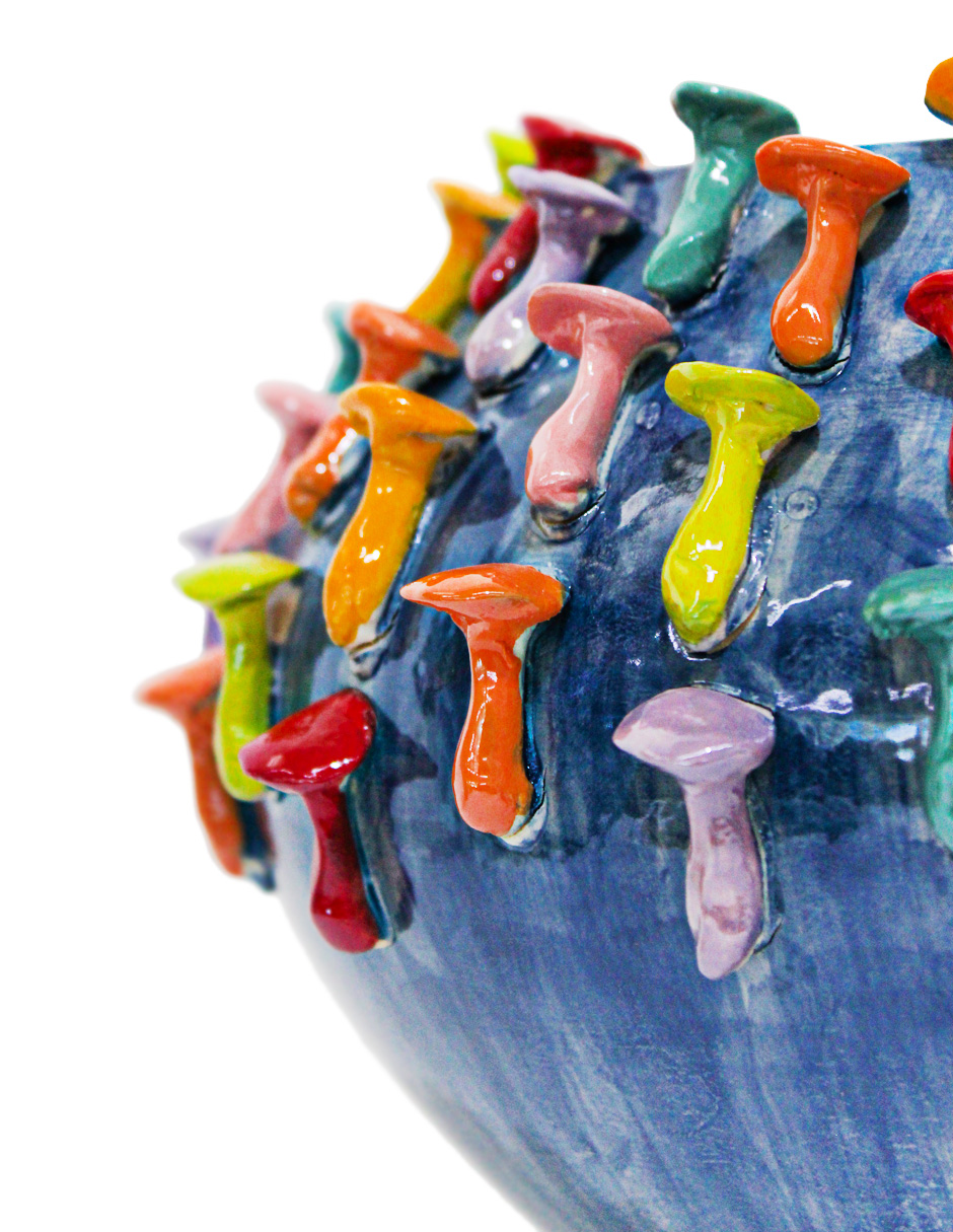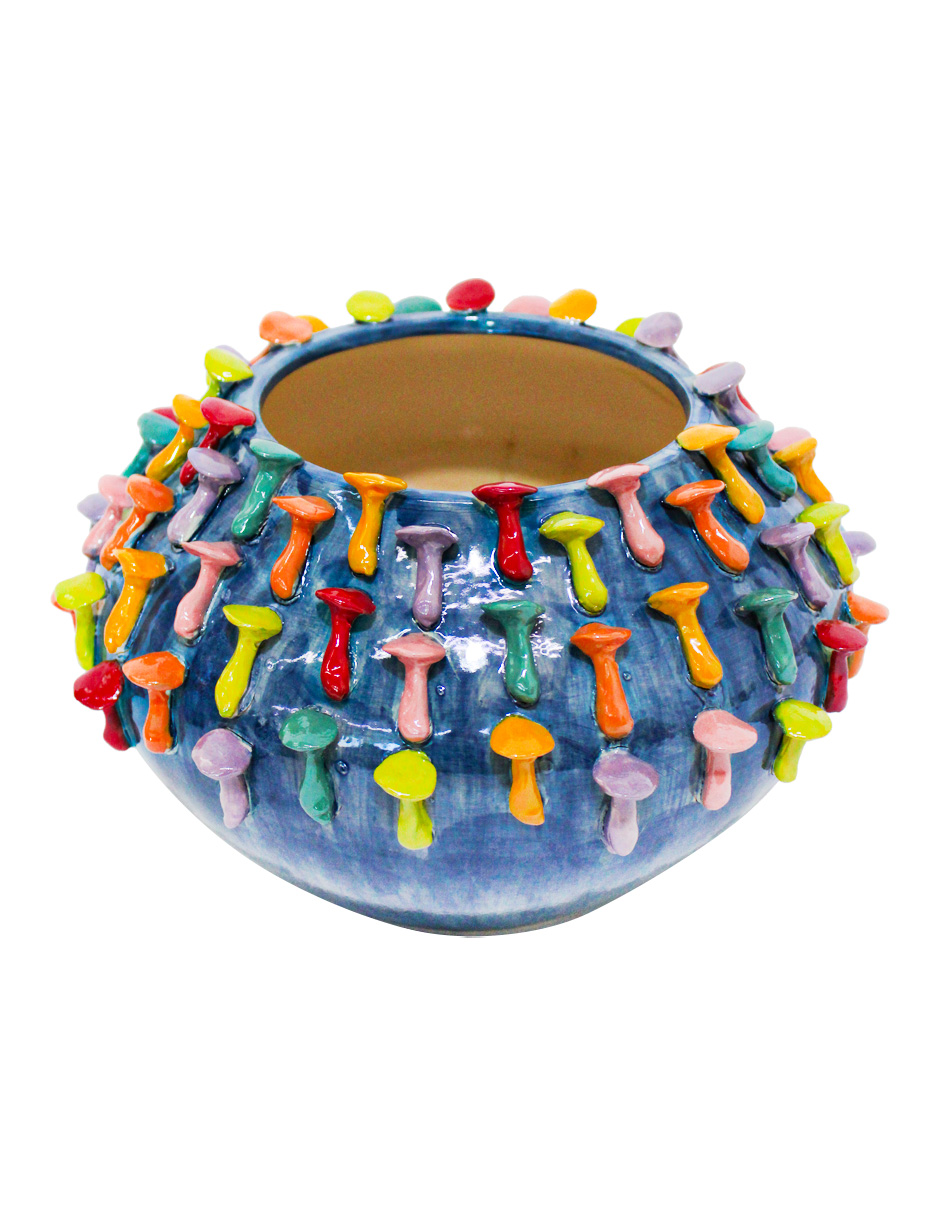 Dale un toque de originalidad y color a tu espacio. Esta vasija azul con diseño de hongos de colores es perfecta para embellecer tu hogar, añadiendo un acento único y divertido. Su diseño te hará sentir la creatividad y la alegría. Mide 23x23x14.7cm.