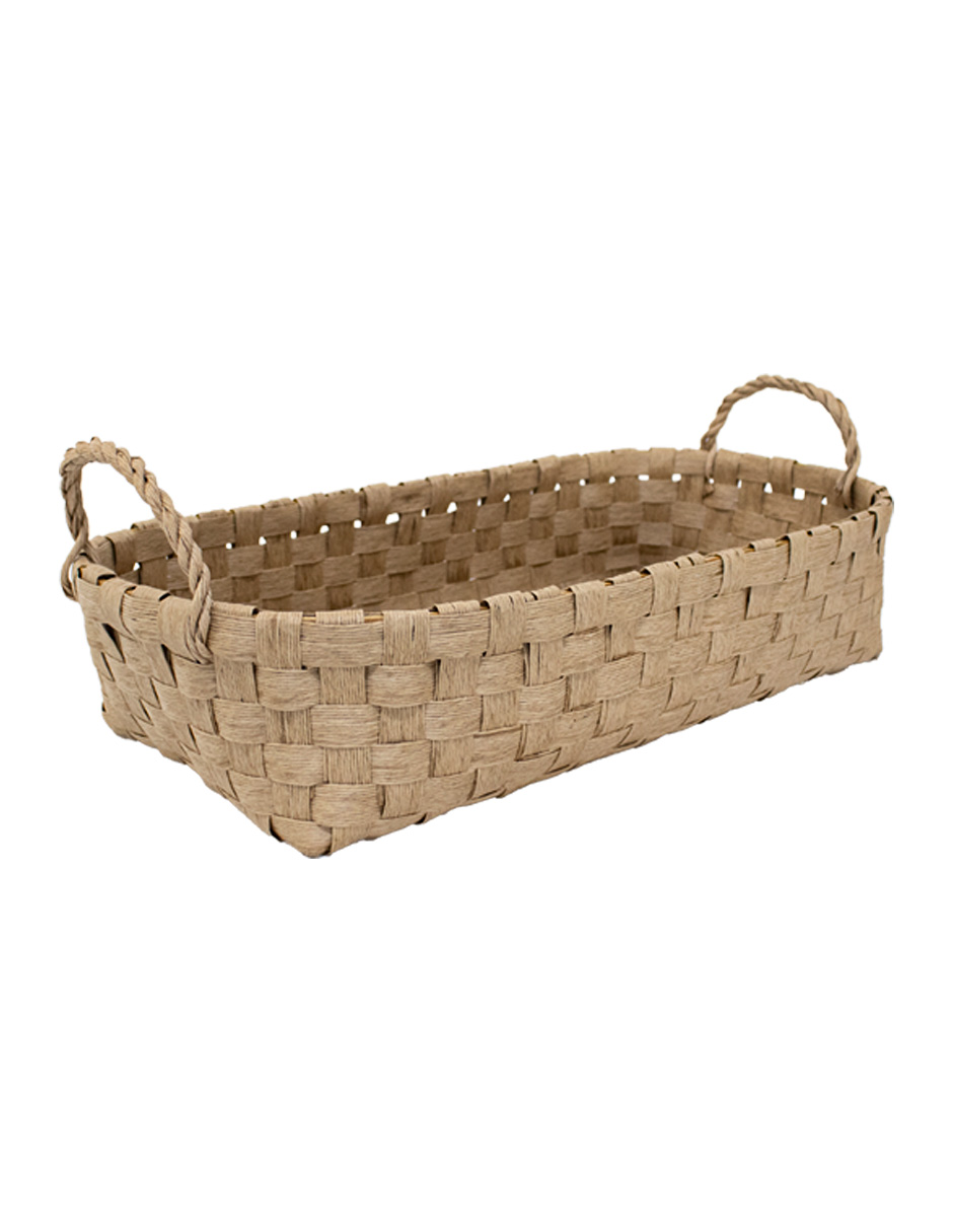 Una elegante canasta cuadrada tejida con prácticas asas de metal negro. Esta pieza es ideal para organizar y decorar cualquier espacio, aportando un toque moderno y natural a tu hogar, perfecta para salas de estar o dormitorios.