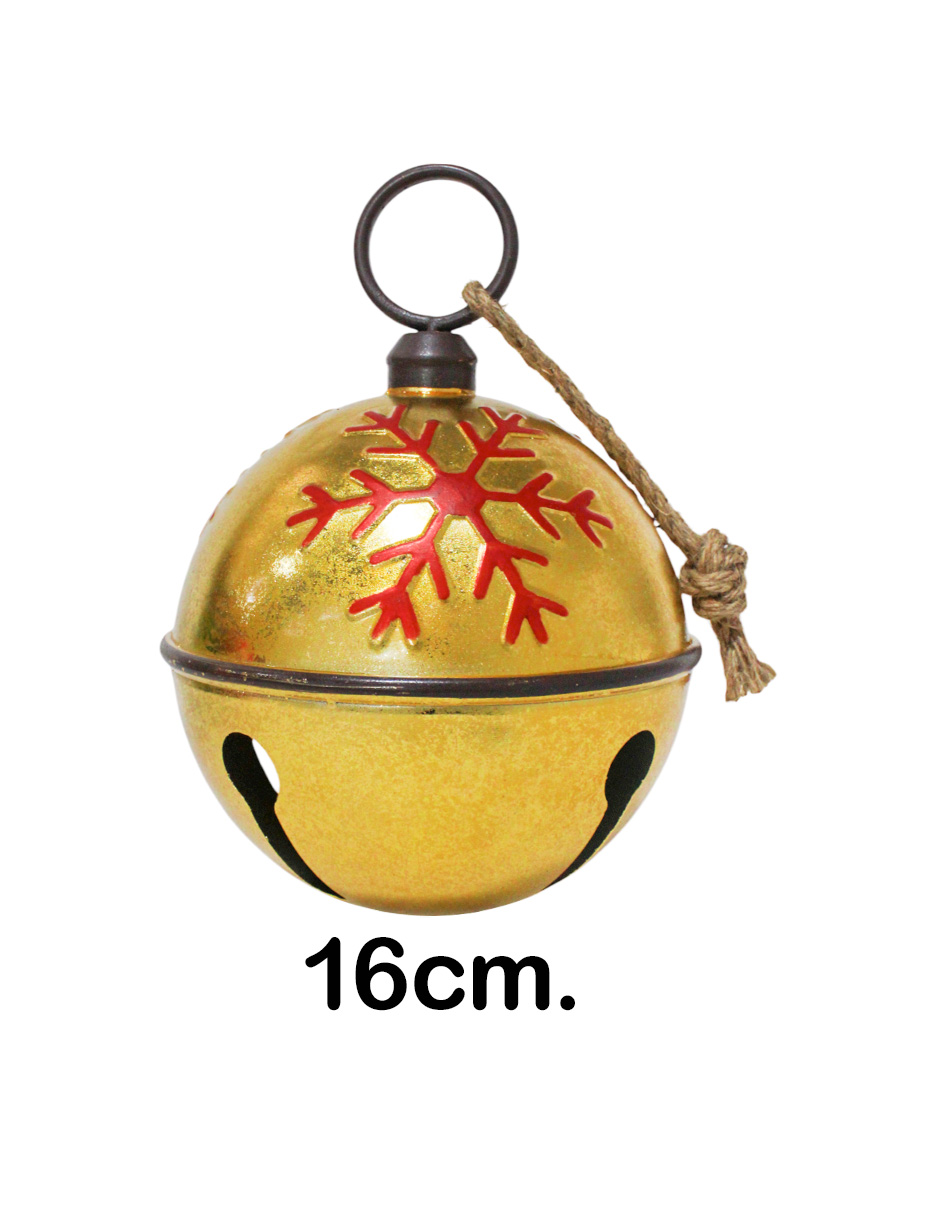 Cascabel decorativo de metal en un radiante color dorado, con un elegante diseño de copos de nieve en color rojo. Ideal para añadir un toque de brillo y elegancia invernal a tu decoración. Material: metal. Medidas: 21x21x29cm.