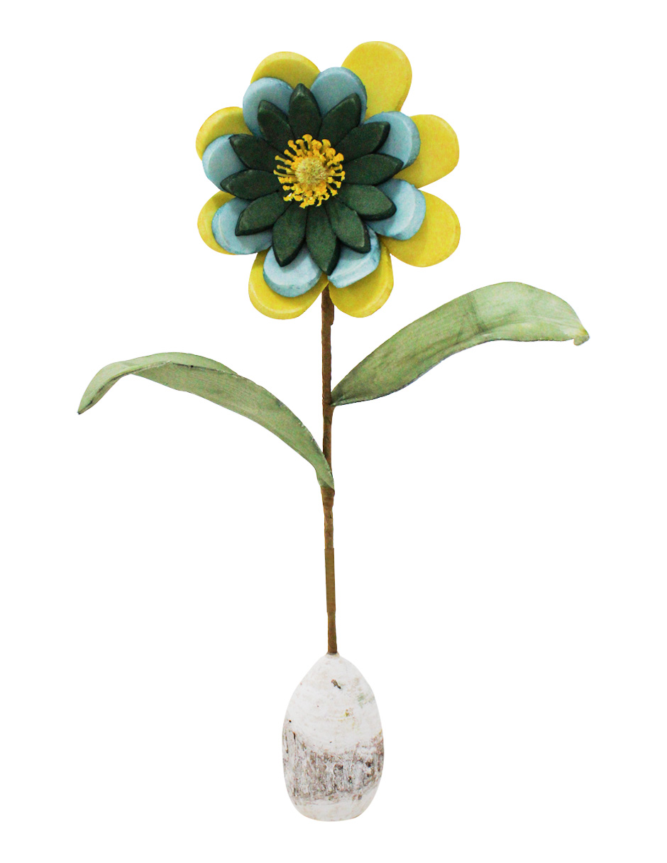 Flor de látex amarilla con azul y verde en base de madera de 12x12x35cm