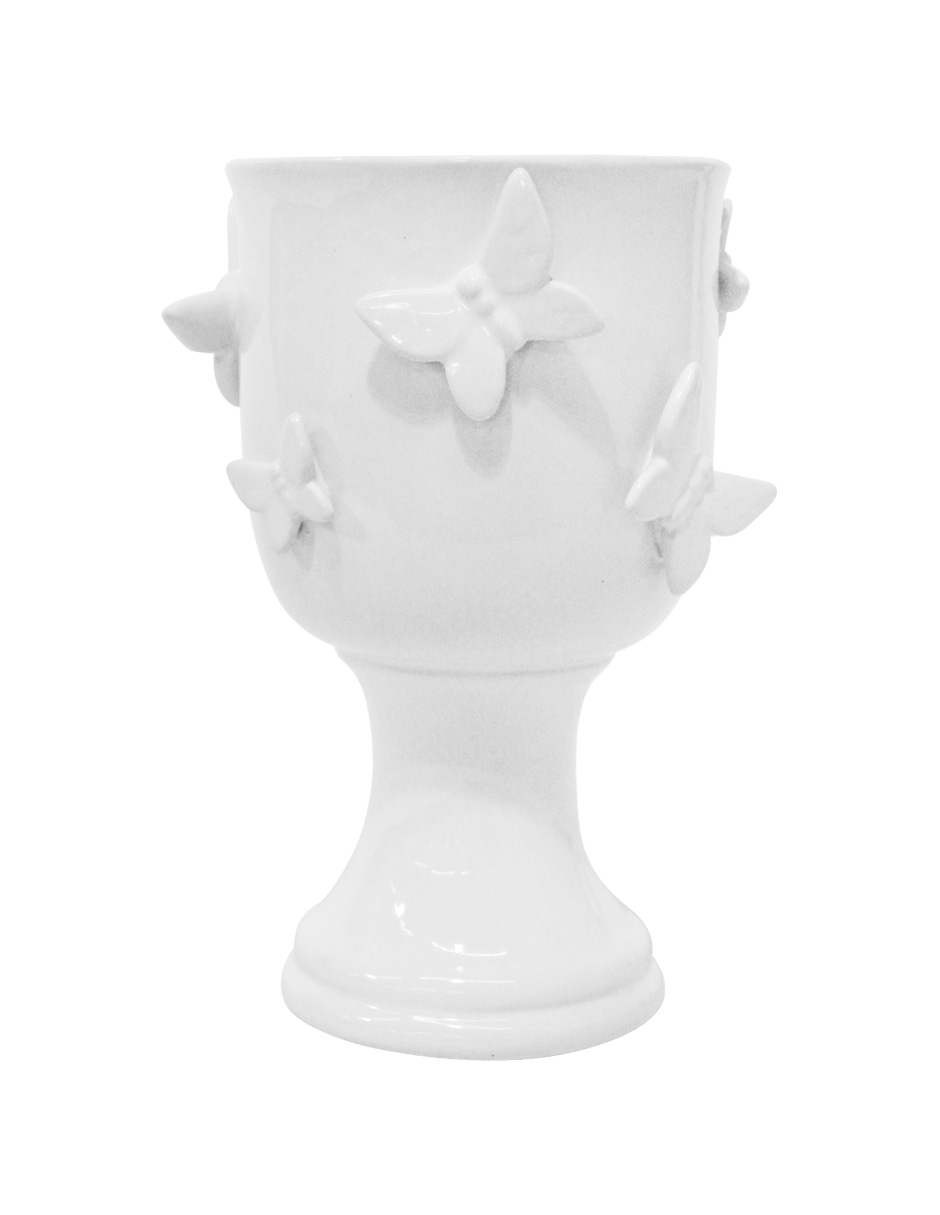 Florero de ceramica blanca con base y mariposas en relieve de 15.6×15.6×23.5cm