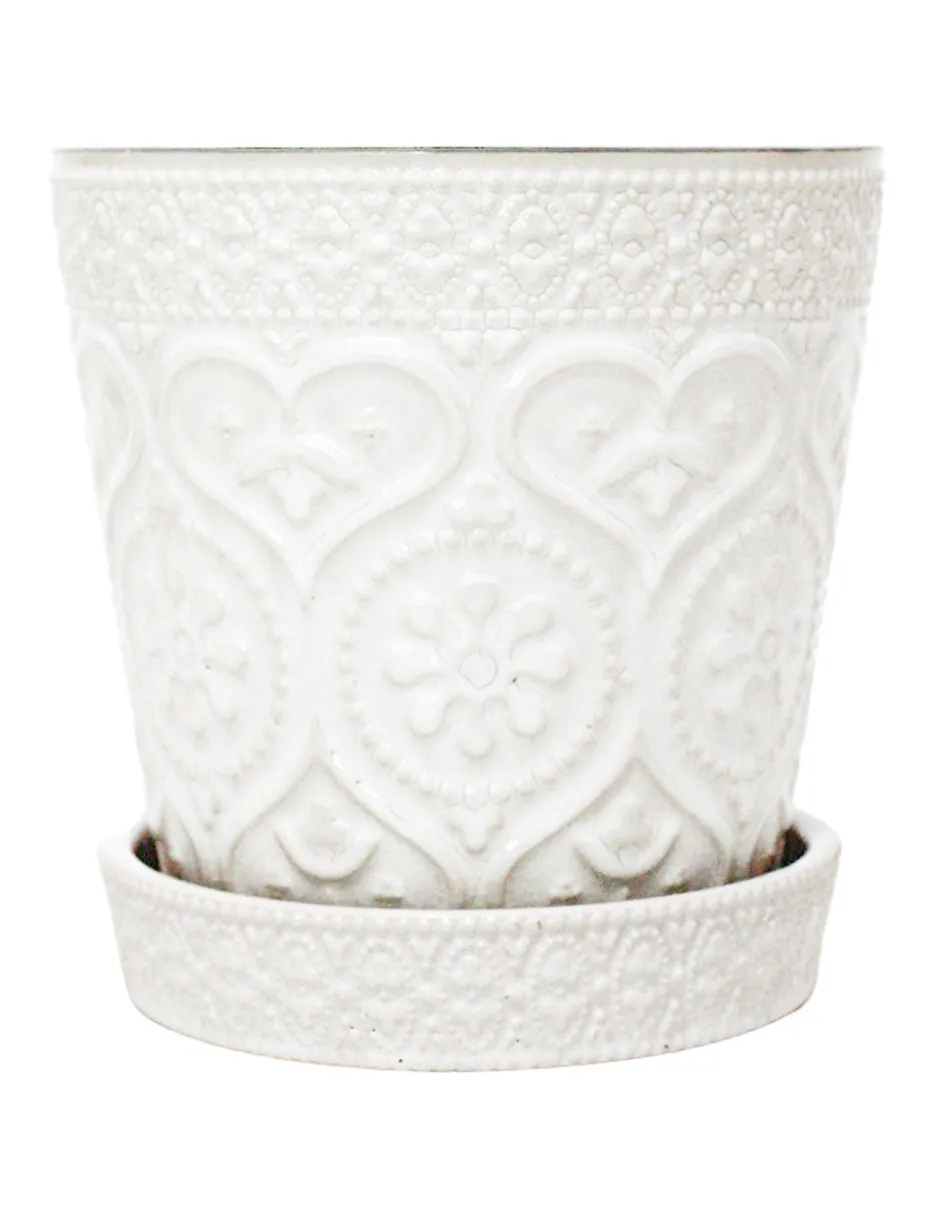 Dale un hogar a tus plantas con un toque de elegancia. Esta maceta de cerámica con plato, diseño grabado en color turquesa, es perfecta para embellecer tu espacio. Su diseño te hará sentir la calma y la tranquilidad que tu hogar necesita. Mide 13x13x12cm.