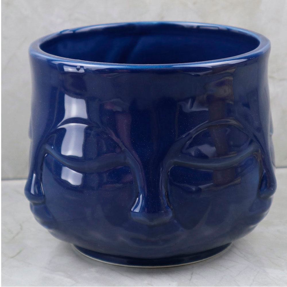 La Maceta de porcelana azul es la pieza maestra para quien busca una estética audaz, un diseño con profundidad artística y una presencia visual imponente en su decoración de interiores. Este objeto ofrece una sofisticación creativa incomparable para cualquier repisa, estudio de diseño o como acento focal en tu espacio de convivencia. Su sola presencia ayuda a elevar la personalidad de tus plantas de manera inmediata. Lo logra mediante su diseño detallado de silueta circular que presenta rostros en relieve con expresiones de serenidad, todo en un profundo azul cobalto de alto brillo, lo que evoca la nobleza de la cerámica clásica con un giro contemporáneo en la categoría de Liquidación.