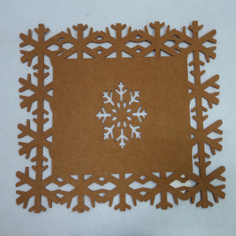 Un elegante mantel de fieltro blanco con una orilla de copos de nieve, con un diámetro de 35 cm. Ideal para proteger tus superficies con un toque de pureza y sofisticación.