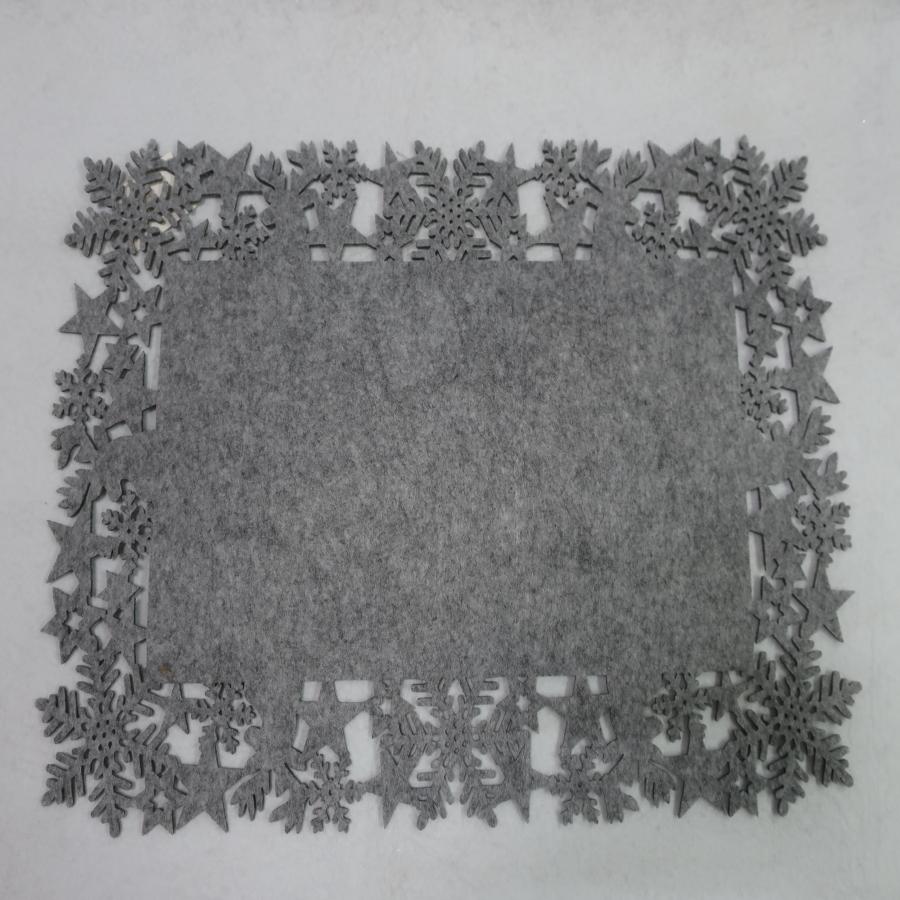 Un rústico mantel de fieltro café con una orilla de copos de nieve y estrellas, con medidas de 44.5×30 cm. Ideal para proteger tus superficies con un toque de naturaleza y fantasía.
