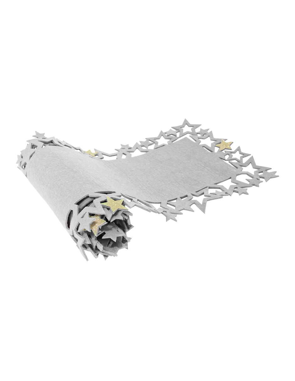 Un elegante mantel de fieltro negro con un diseño de estrellas, con medidas de 45x33x0.3 cm. Ideal para proteger tus superficies con un toque de lujo y modernidad.